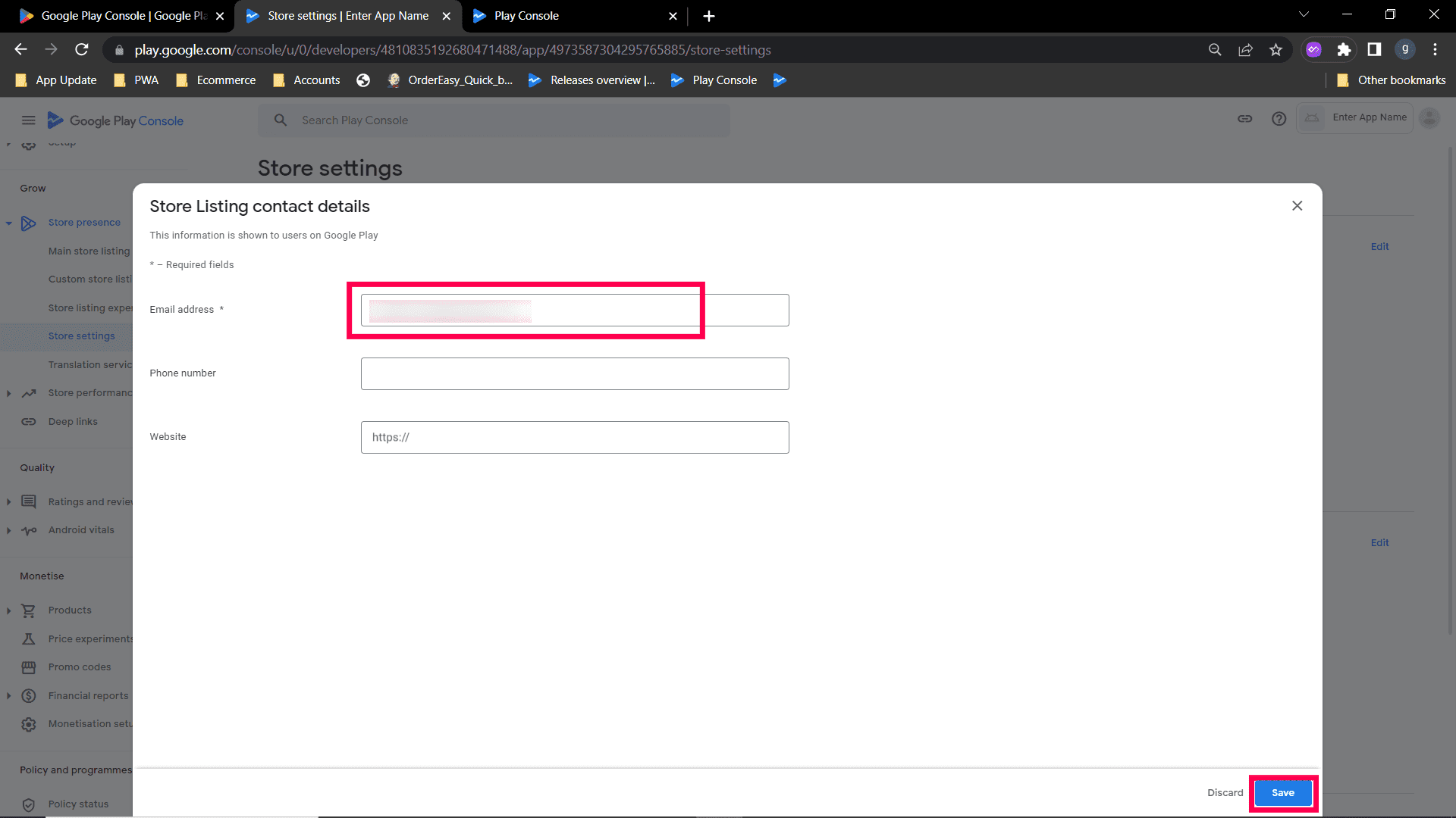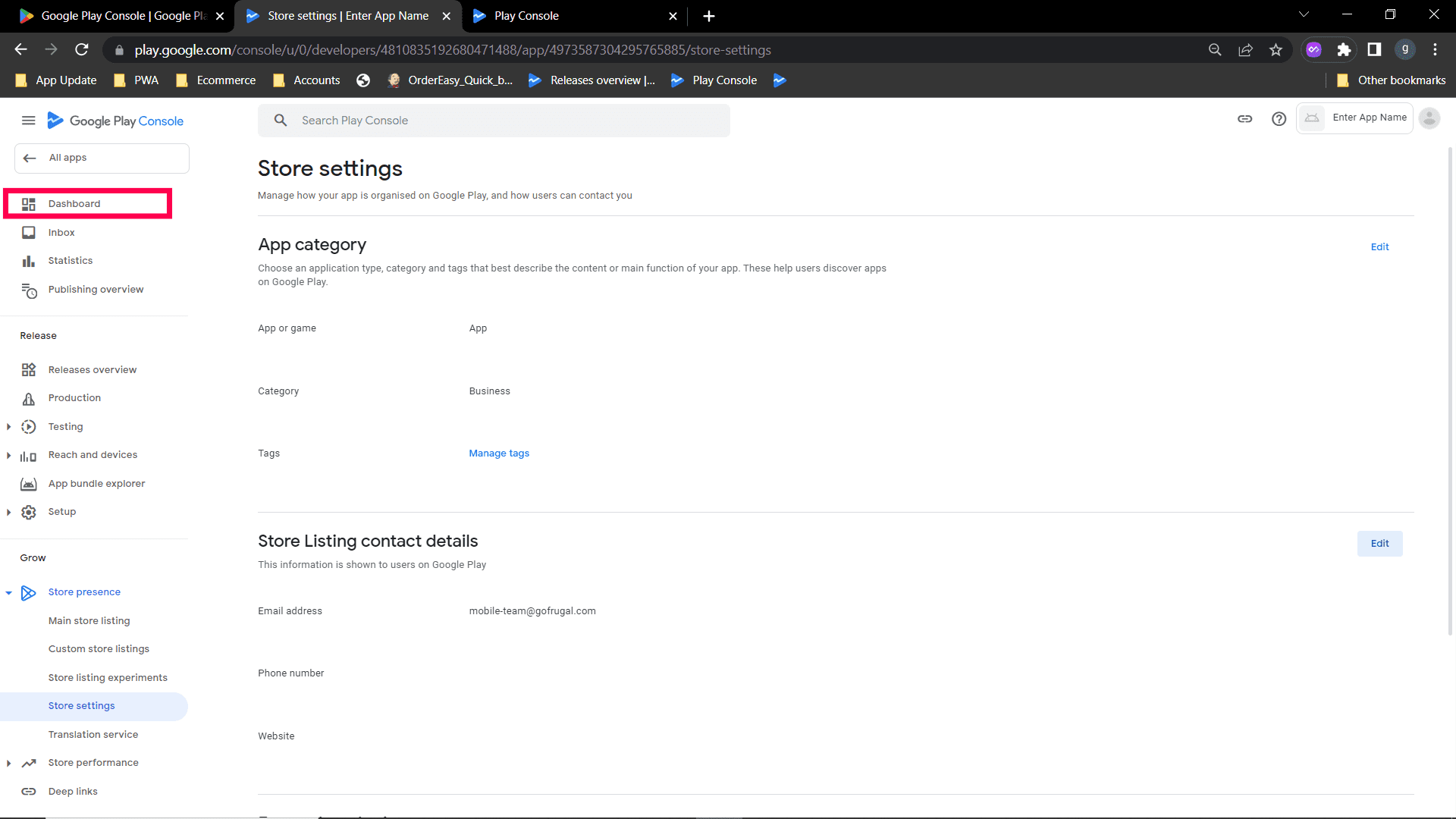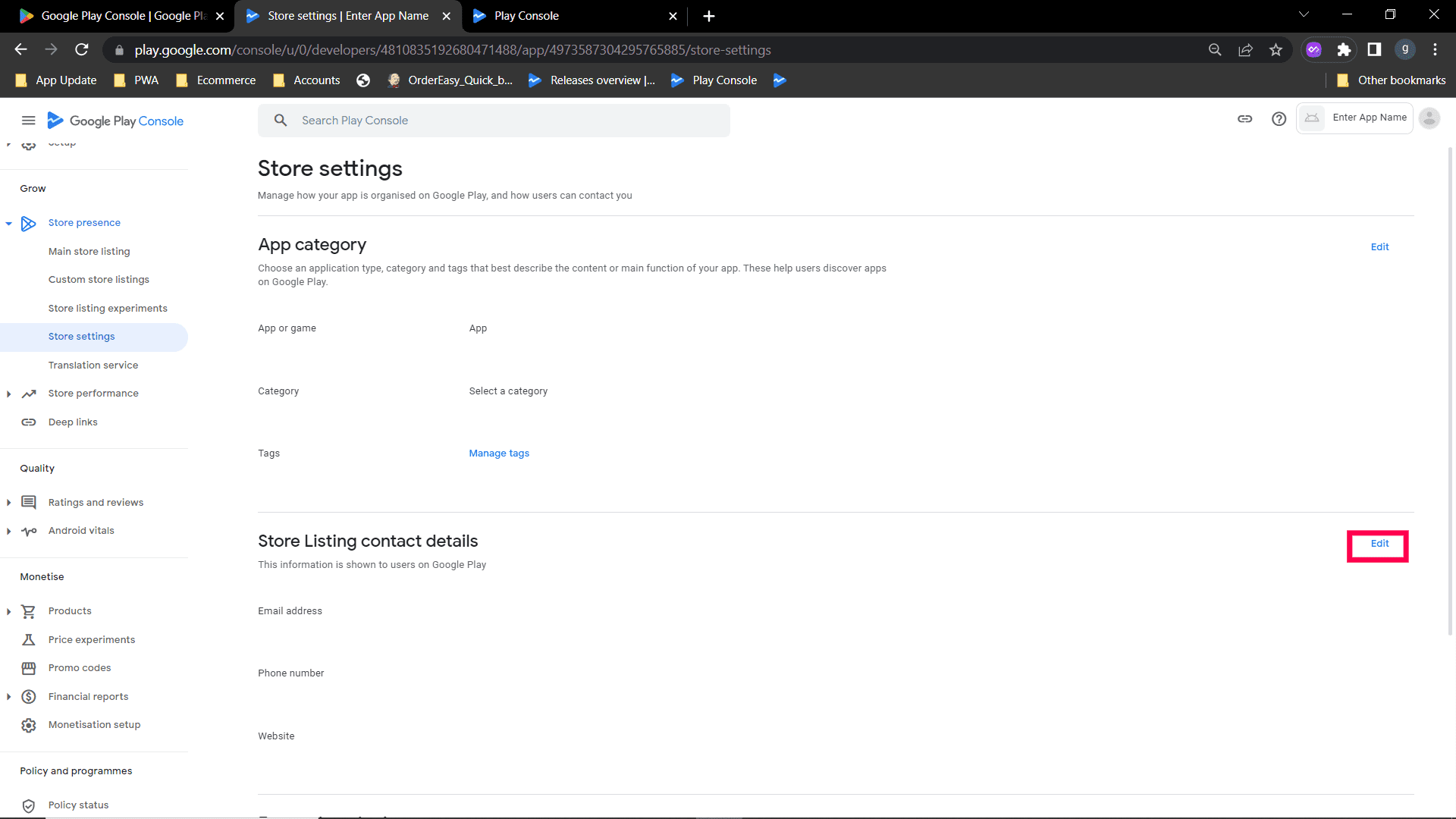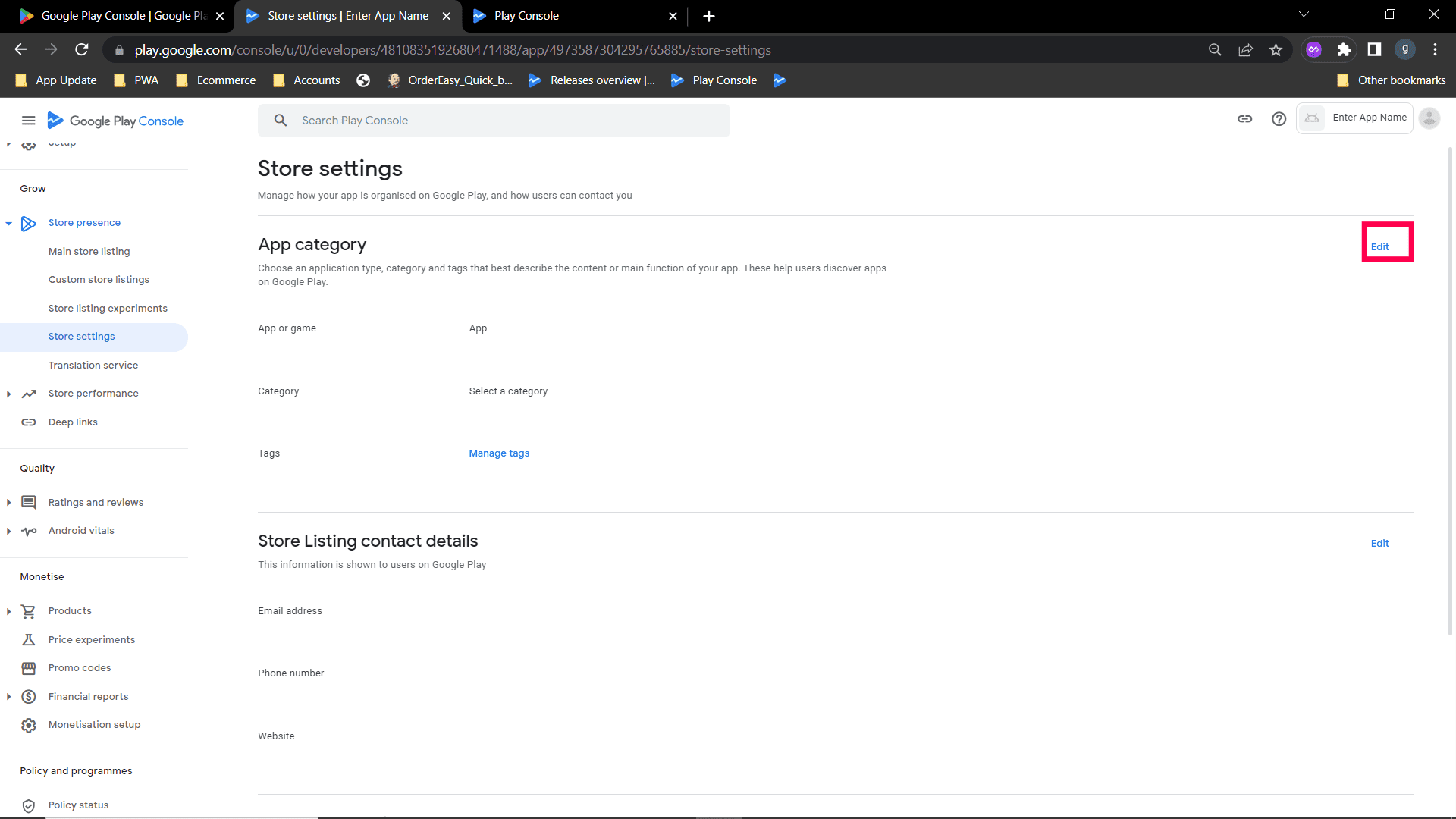 Step 4: click Edit, a page will open to edit store listing contact details