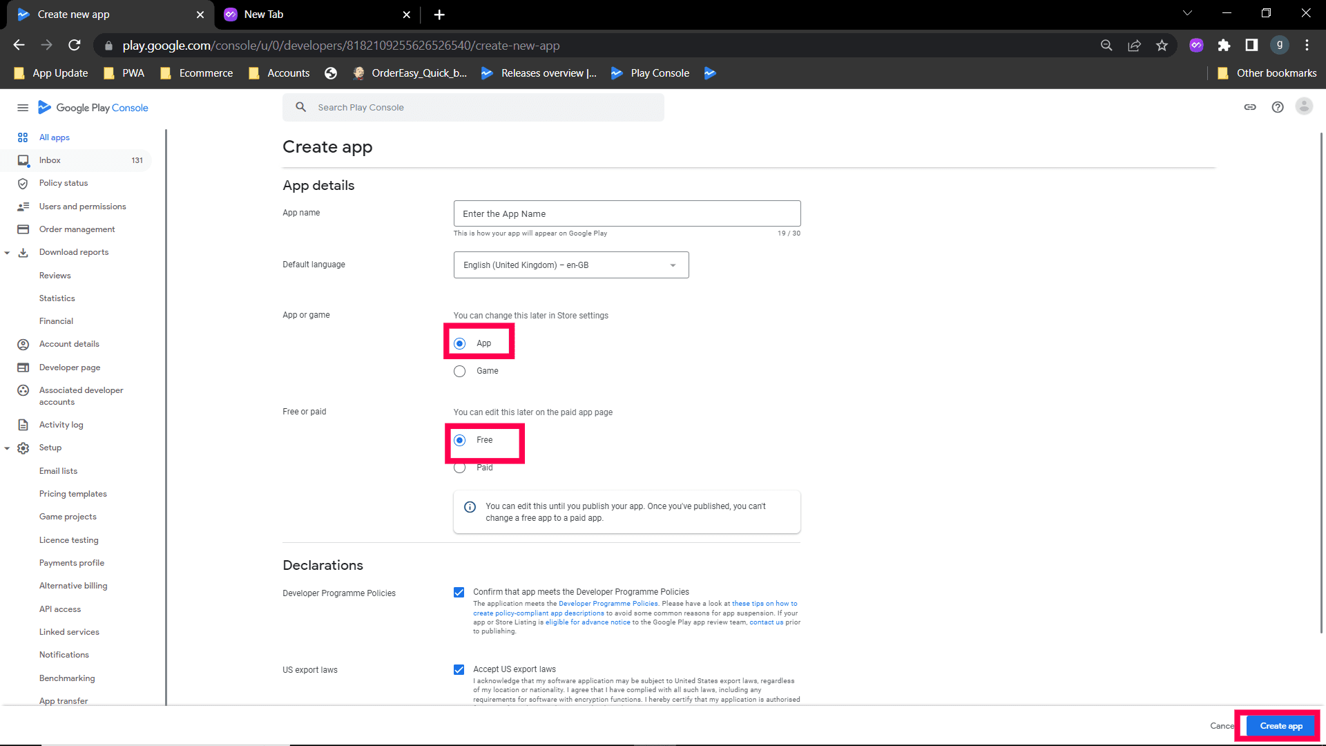 Step 4: Enter the App name and the type as App and choose Free and apply the declaration and create the app