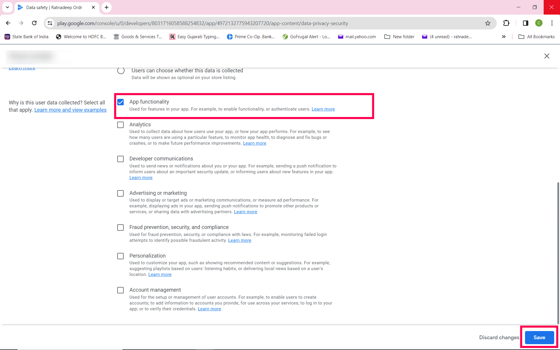 Step 9: For Why is the user data is collected -- select App Functionality and click Save