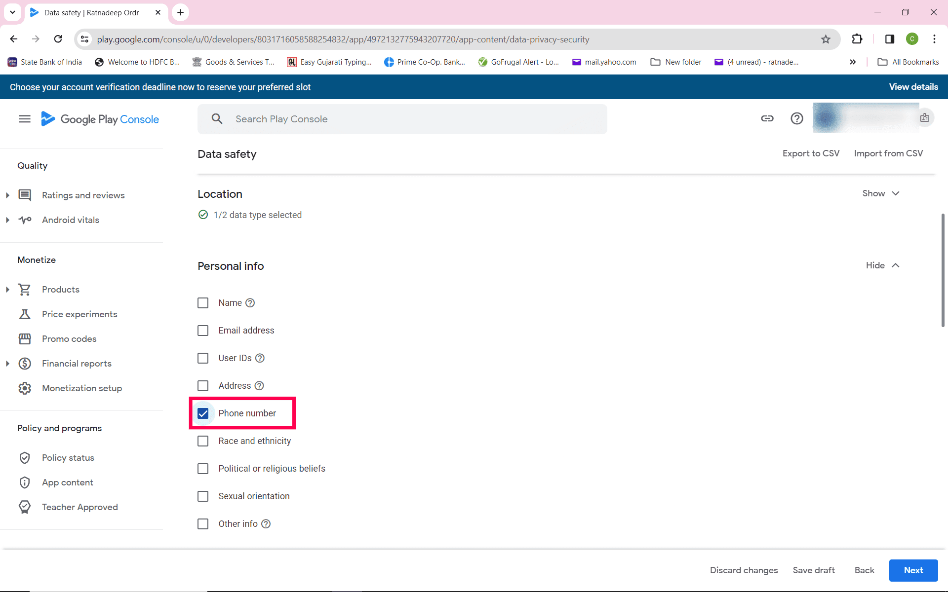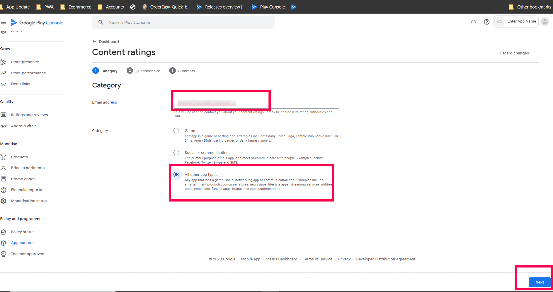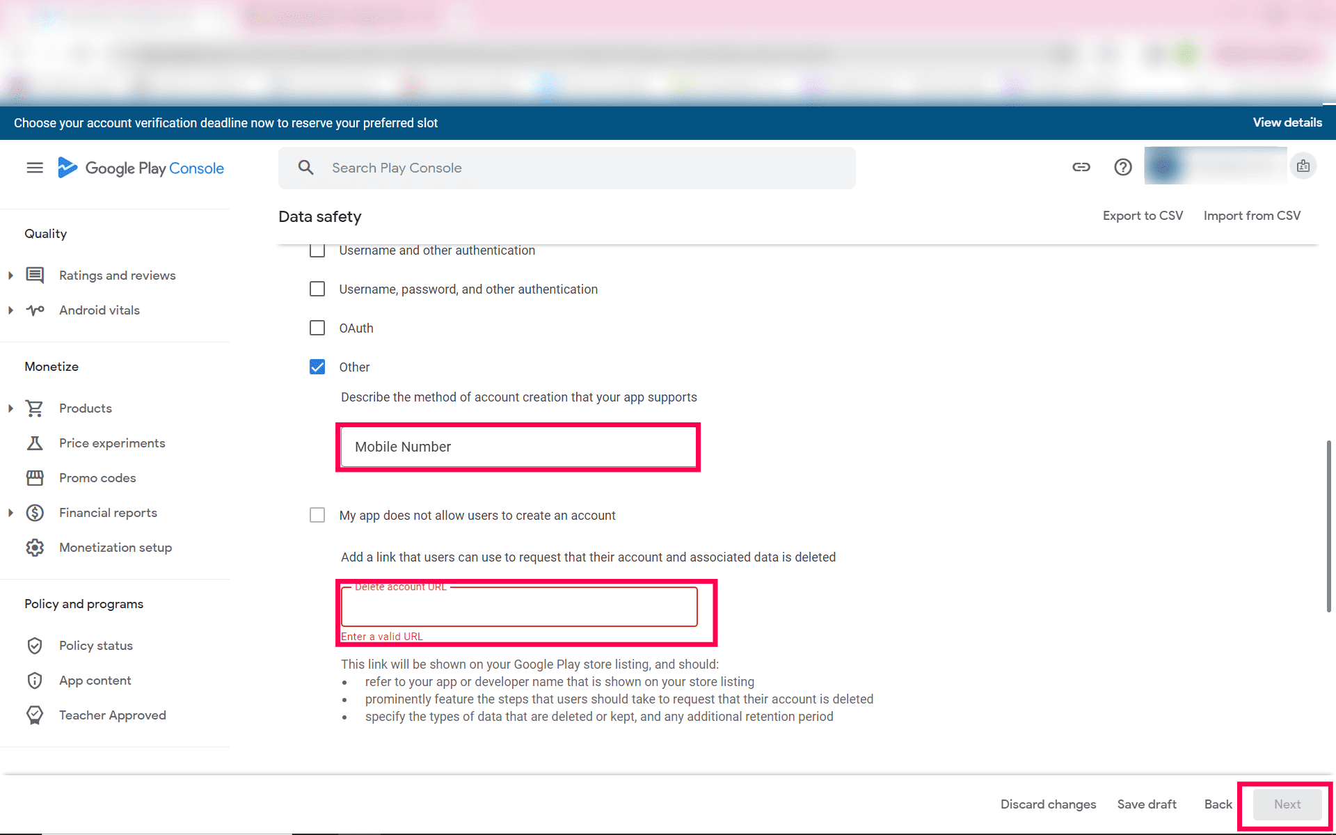 Now select "Other" and enter Mobile Number. Then Copy the PWA url & paste it in the Play console under Delete Account URL and Click Next