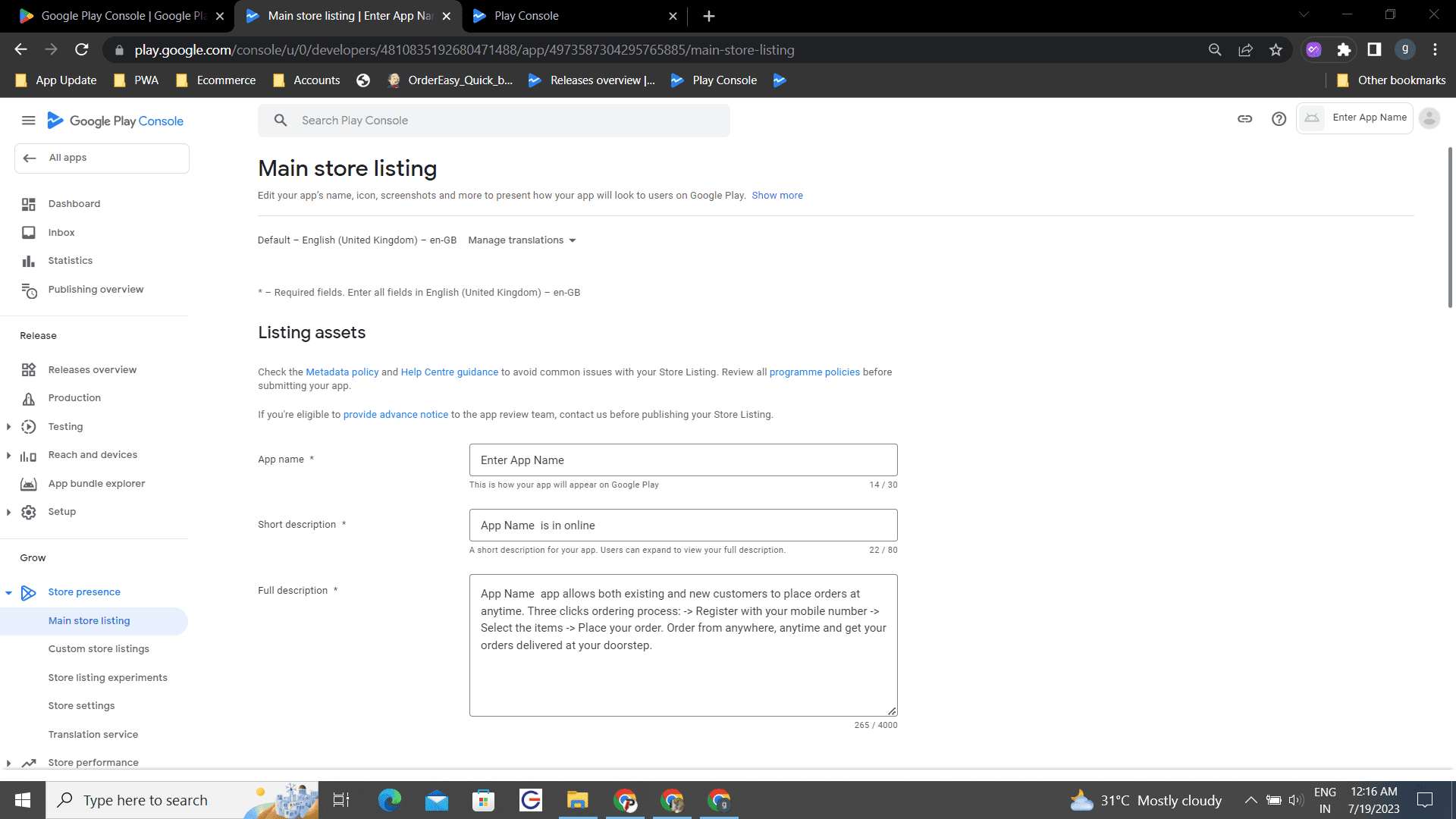 Step 8: In Main store listing Enter Your App Name, Short Description and the long description of the app .
