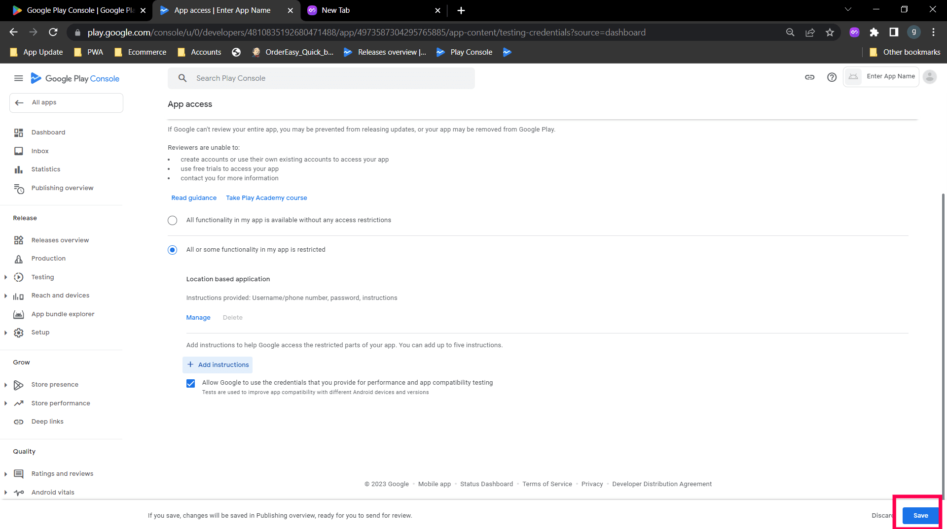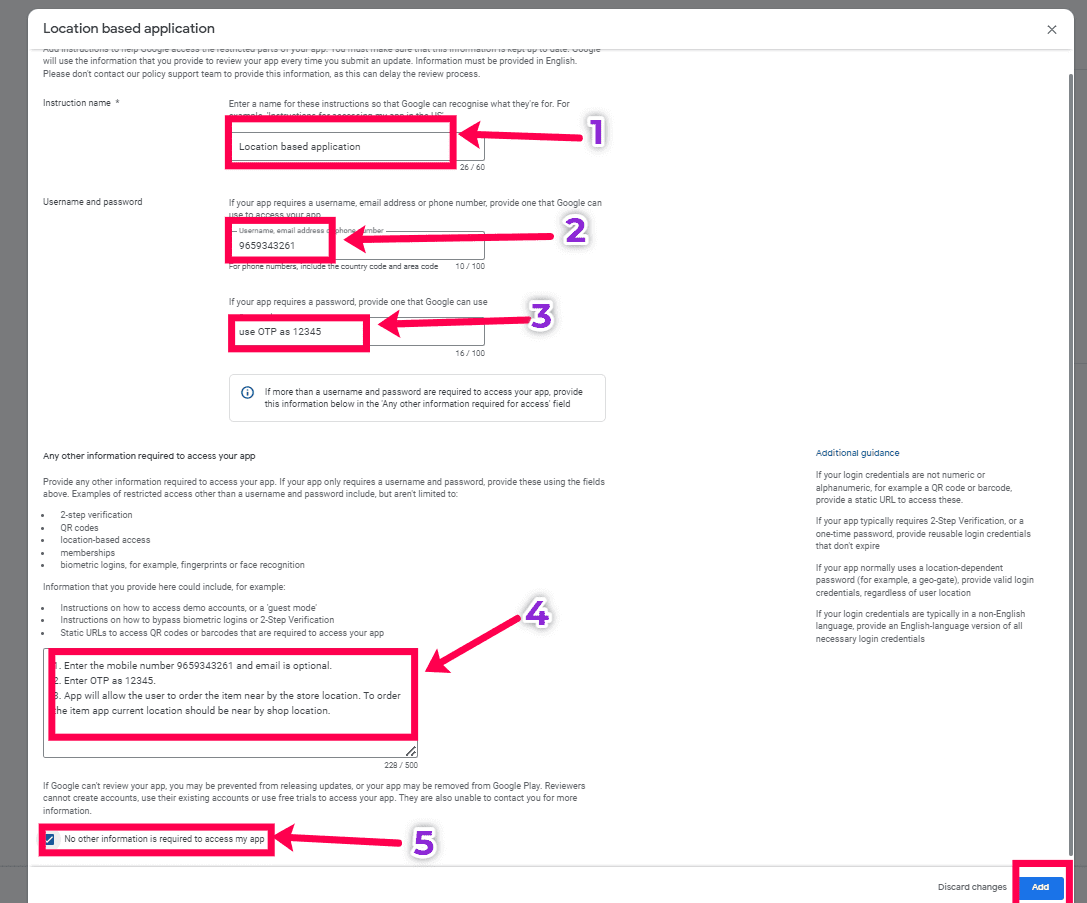 5. After entering the instructions, select the check box - No other information is required to access my app