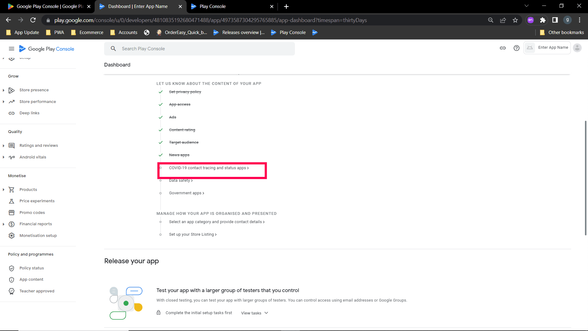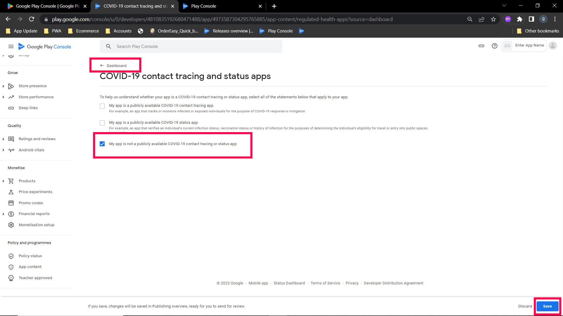 Step 8 : Select My app is not a publicly available COVID-19 contact tracing or status app & save. Go to Dashboard