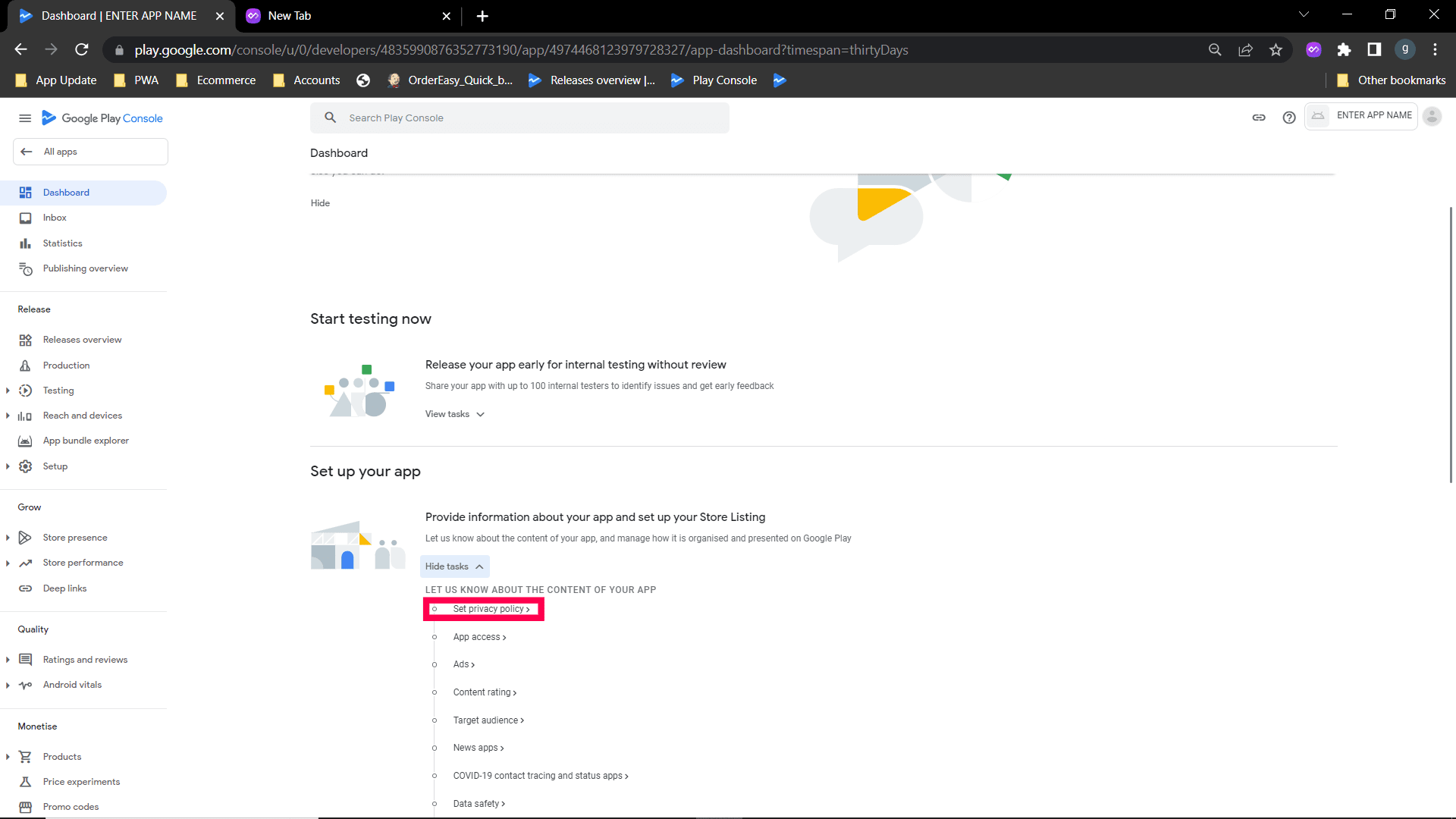 Step 2: After entering into the account, in dashboard, you need to setup your app and click set Privacy Policy.