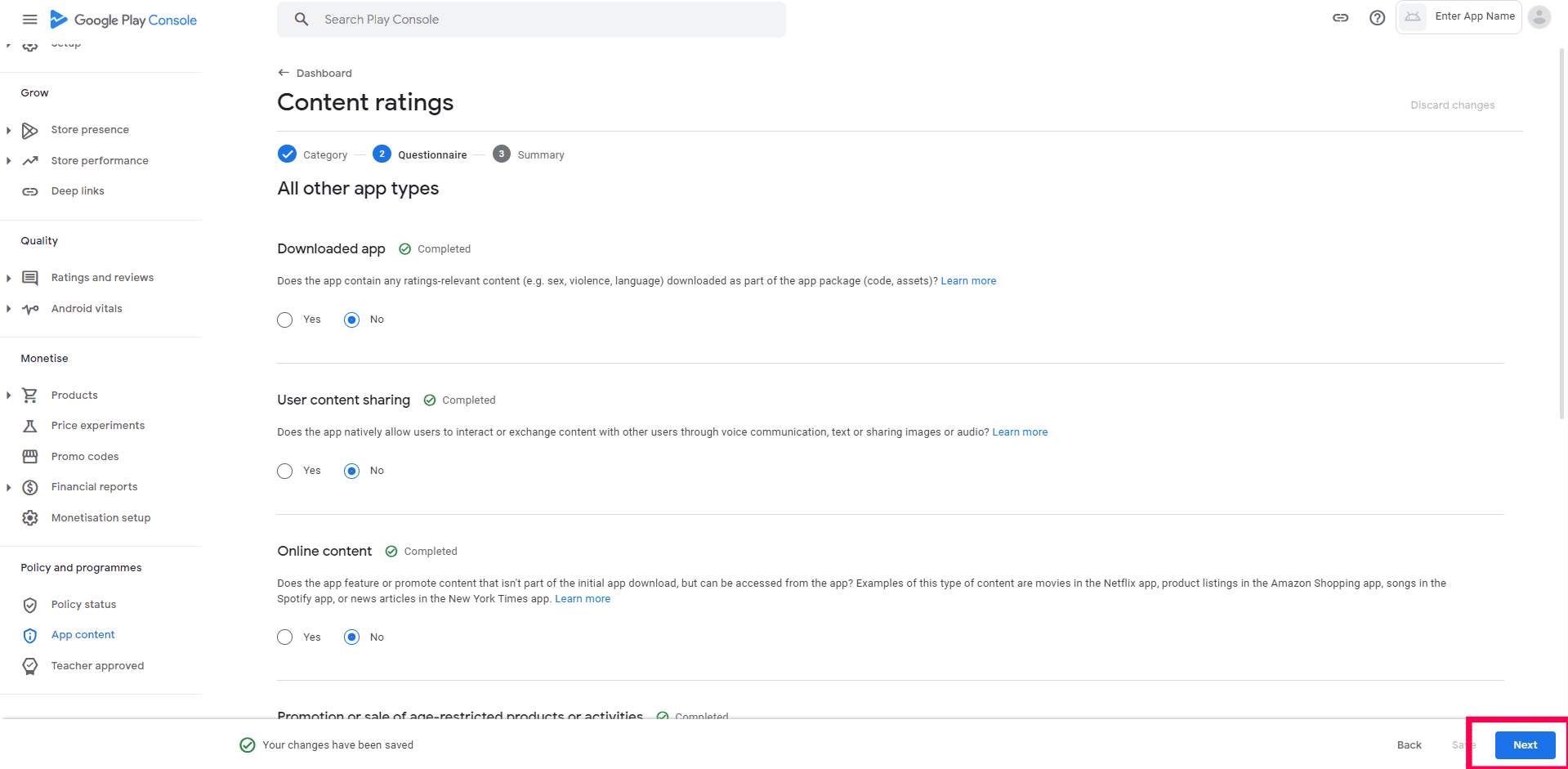 Step 6 : In All other app types, select "No" to all the options and click save