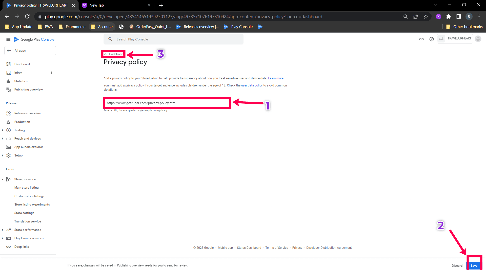 Step 3: After clicking Privacy policy Page, enter your privacy policy link mentioned below and save. Now go back to the Dashboard menu