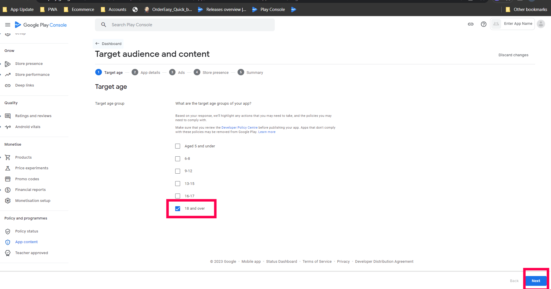 Step 2 : Select 18 and over in the Target age and click next & you will be redirected to the store presence page