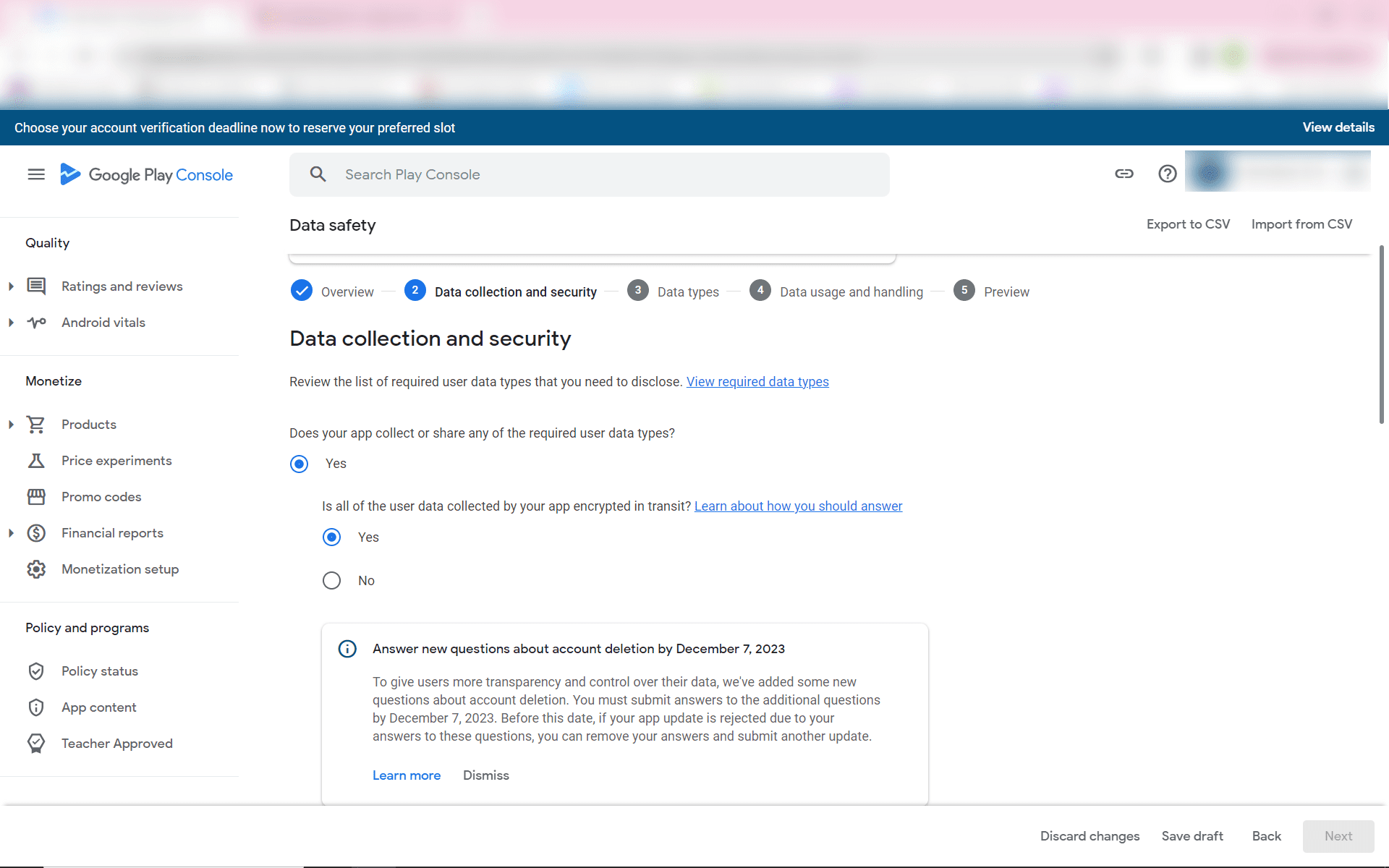 Step 3: In the Data Collection and Security Page ,Click Yes for "Does your app collect user data and for app encrypted in transit" and scroll down