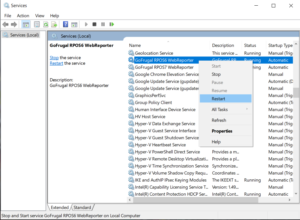 On the Service window scroll down to 'GOFRUGAL ROPS6/7 WedReports', right-click on it & restart the service OR you can click on the restart button on the left panel to start the WebReport services.