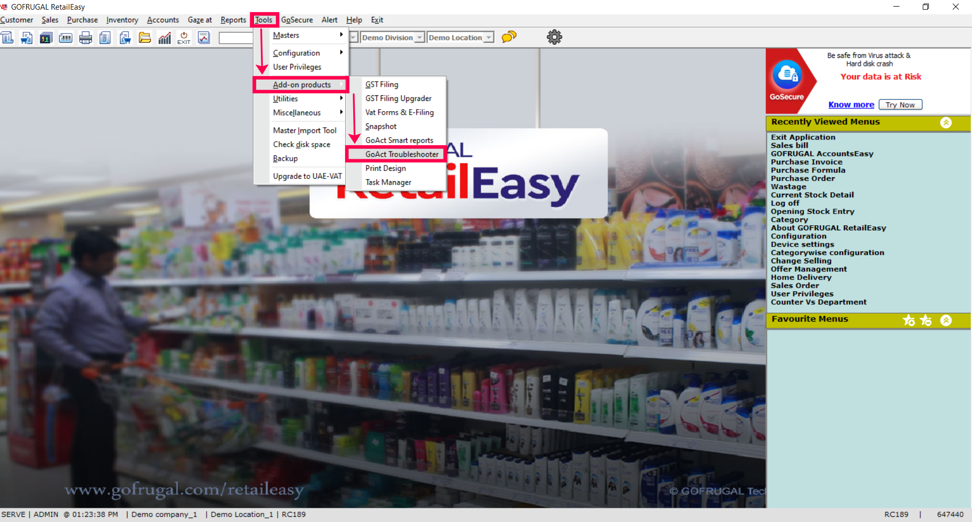Go to 'Tools' menu -> click on 'Add-on products' -> then select 'GoAct Troubleshooter'.