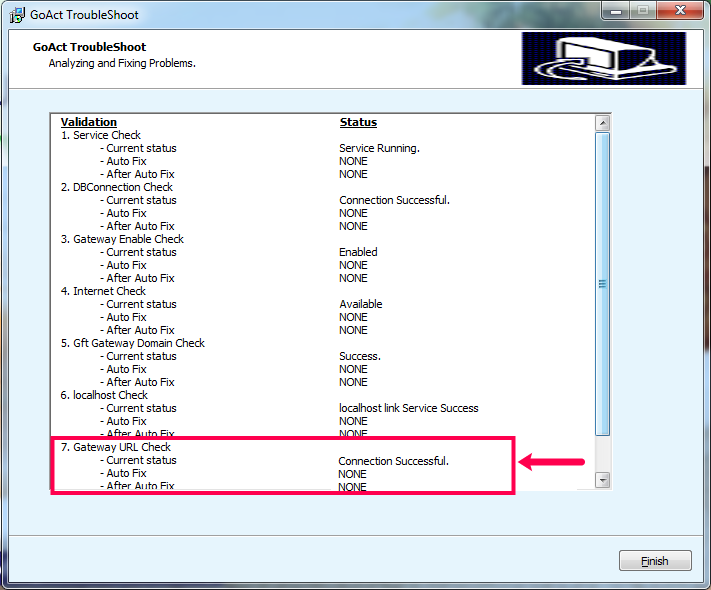 On the appeared GoAct Troubleshooter window, let it complete the analysis for all the listed parameters in the window, upon completion of the analysis & confirm if the status of 'Getway URL check' is showing as successful.