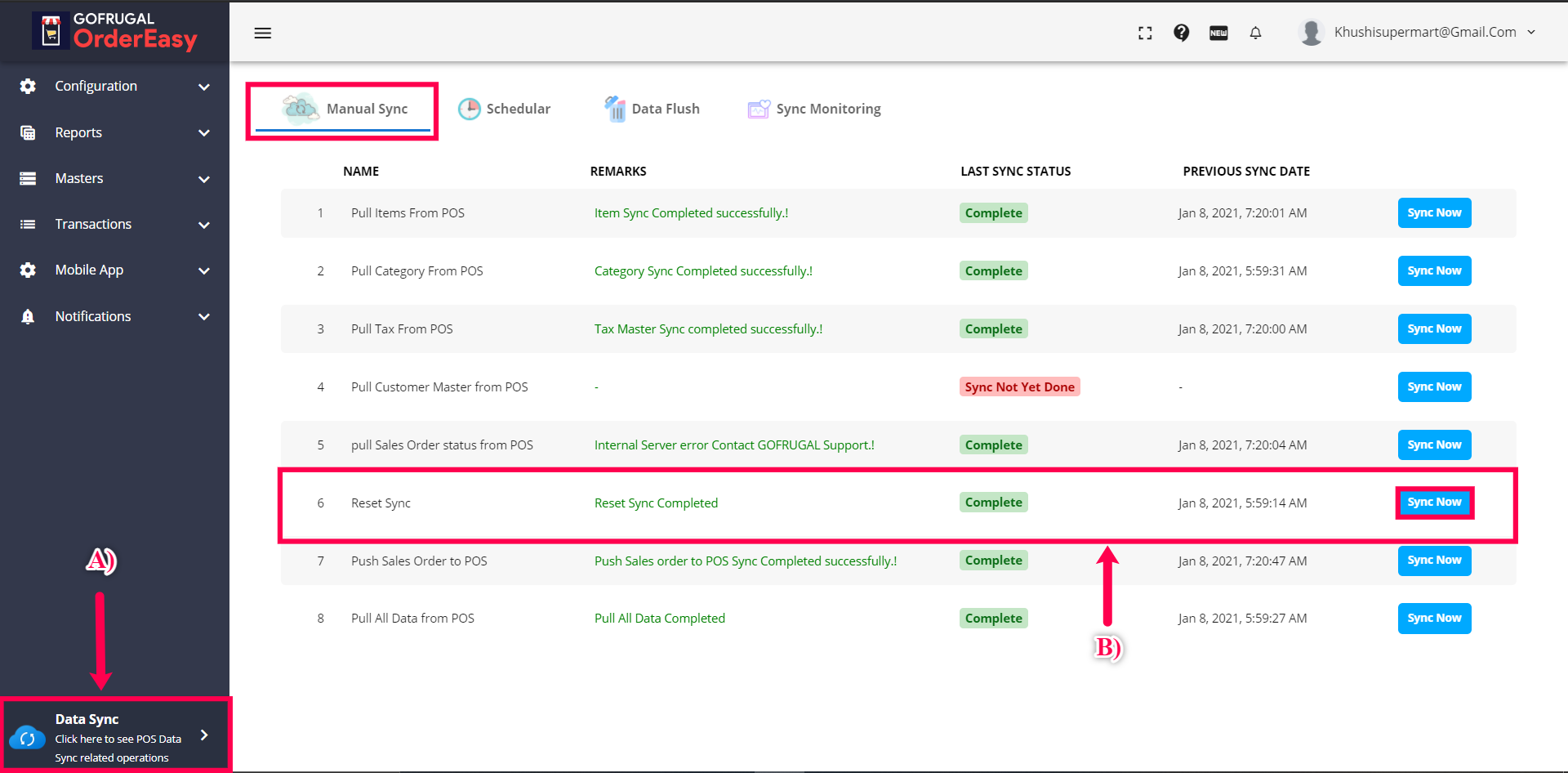 B) On the 'Data Sync' screen, in the 'Manual Sync' tab, click on the 'Sync now' button against the 'Reset Sync'.