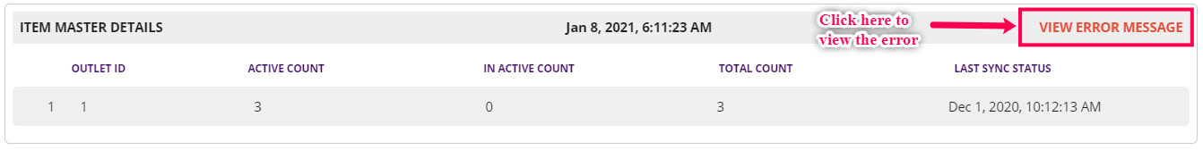 Note: If everything is functioning fine, then there won't be any errors & the status will reflect as 'Item Sync Completed Successfully'. However, if there is any problem with the data sync, an error link 'VIEW ERROR MESSAGE' will be displayed in red color instead of the status. Click on the error message to view the error.