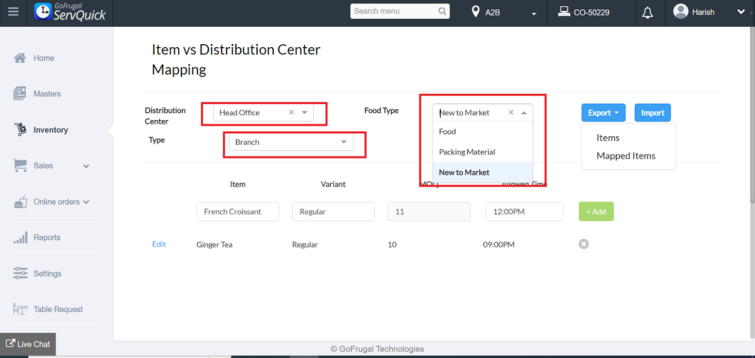 Step 1: Choose the Distributor center, Food Type , and Business type franchise or Branch.