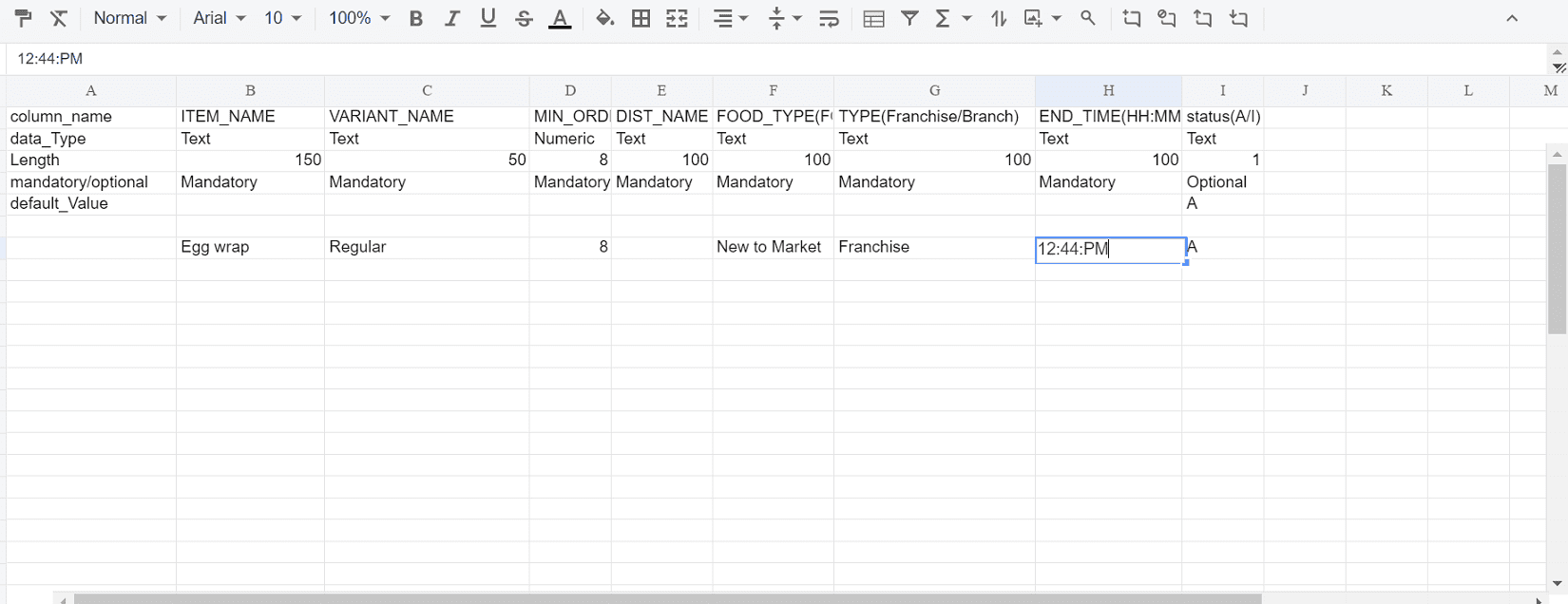 Fill out the provided template with the information of Item name, Food type , MOP ,Type and Allowed or End time as per your need.