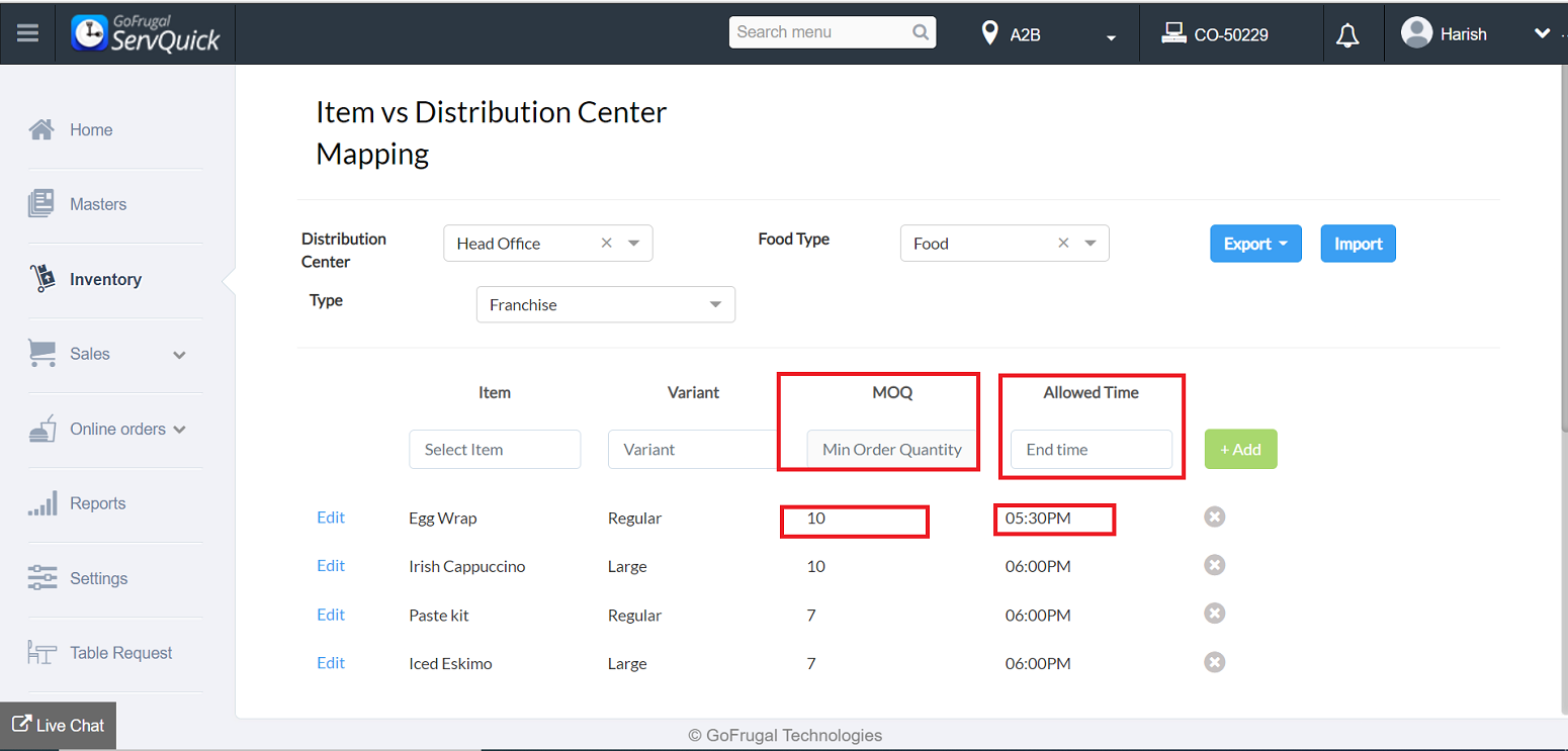 MOQ (Minimum order Quantity)->Based on the Franchise and Branch for each item have to set the minimum Order Quantity so that franchise and branch will not be allowed to raise the purchase order for item less than configured quantity.