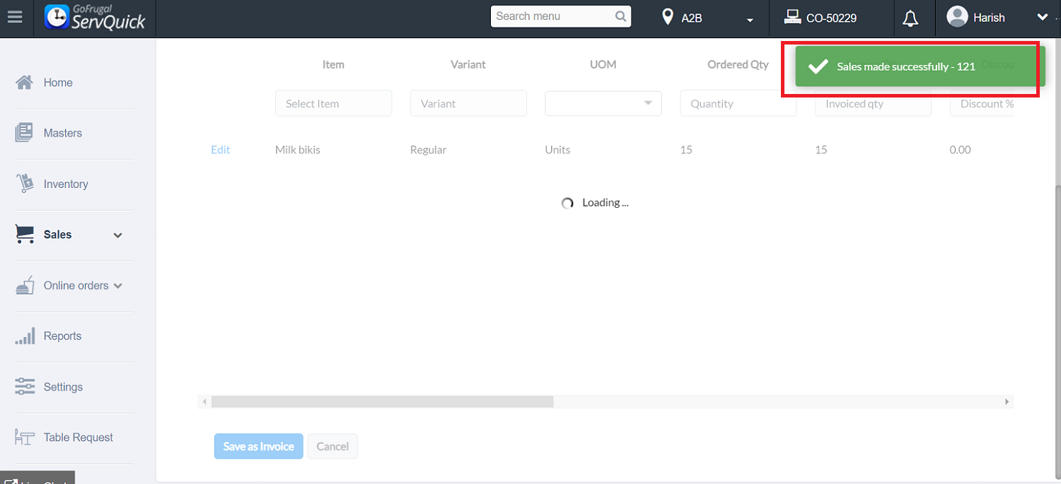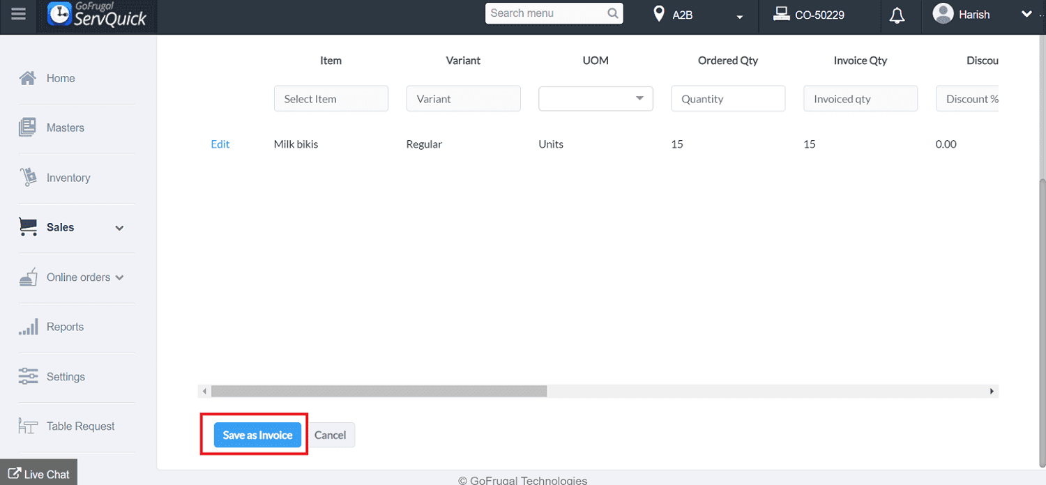 Step 4:Now Distributor center can view the purchase order details which has been raised by franchise branch->Click on "Save as invoice".