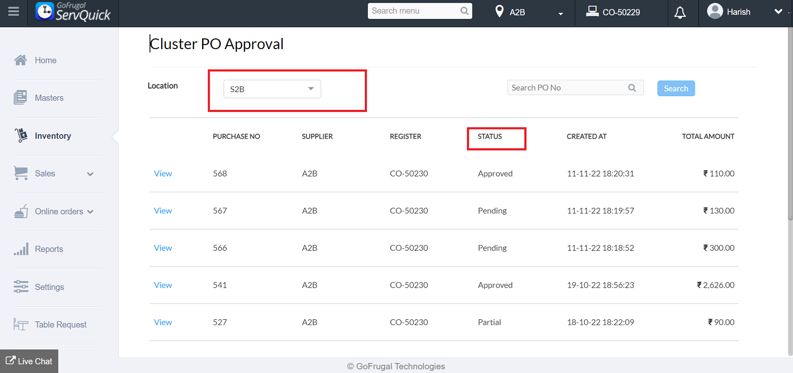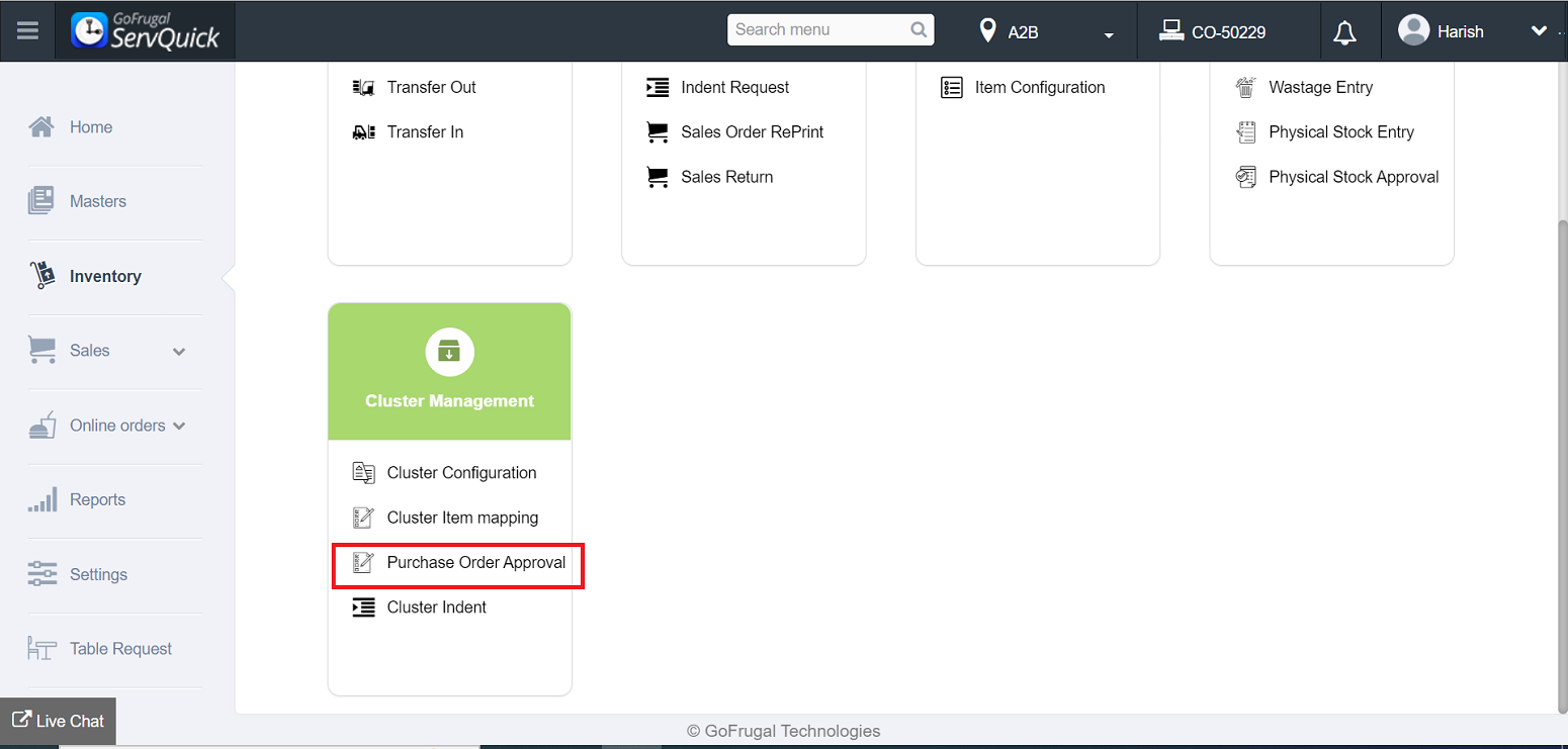 Go to Inventory ->Cluster Management ->Purchase order approval screen.