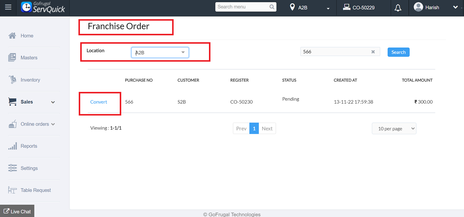 Step 3:Choose the respective location ->Now purchase order created by franchise location will show in the screen ->click on "Convert"