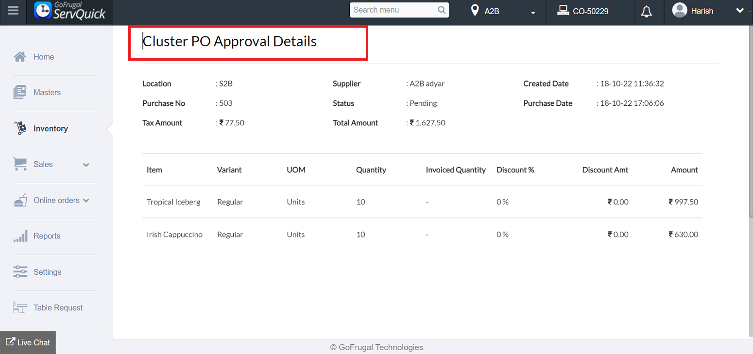 Now can view the Cluster PO Approval detail of the items and other few details.