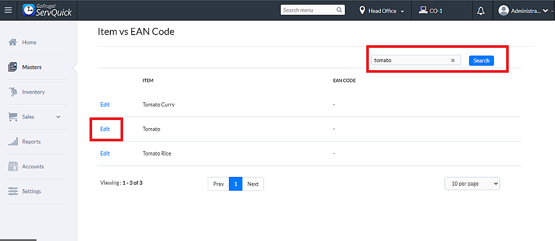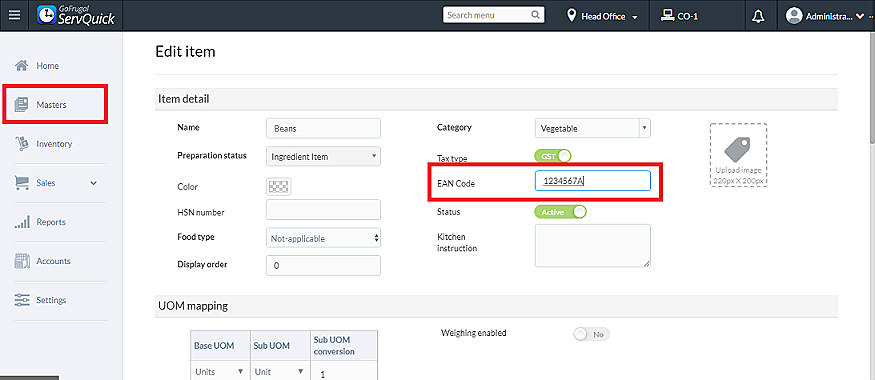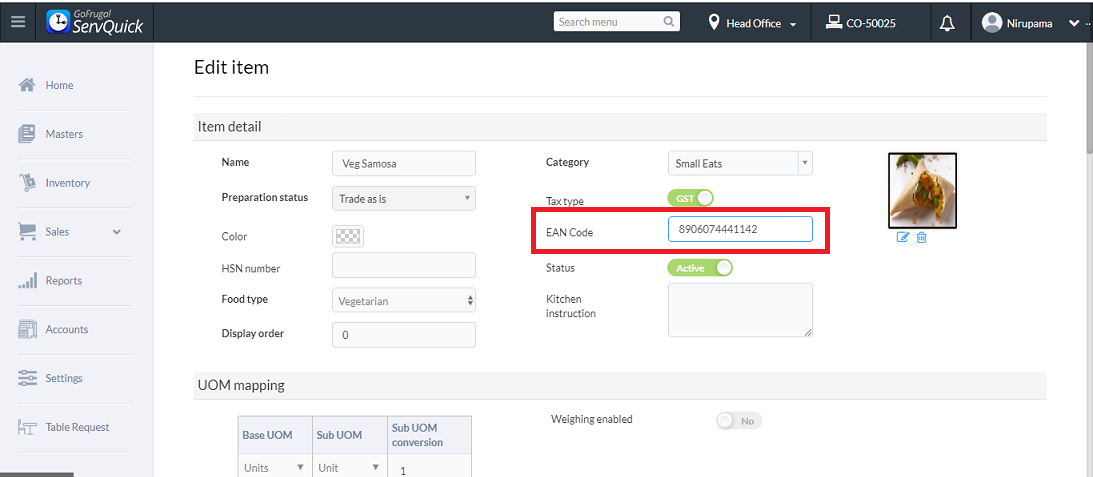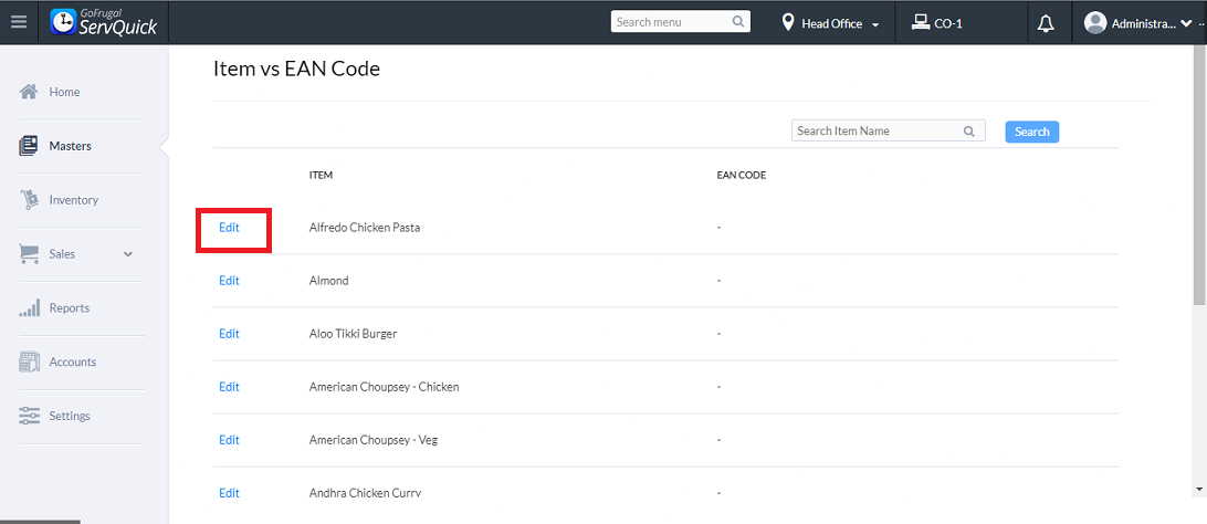 Step 3: Click on edit to scan / update the Ean code for the item and its variants.