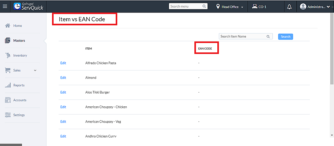 Step 2: The list of items will be displayed with EAN codes for the items if already updated