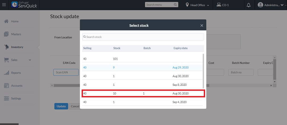 Once the ean code is chosen, the item with the batch number, expity date and the stock will be displayed and the stock update can be done for the respective batch