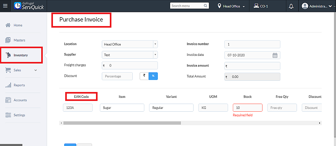 Enter the purchase quantity of the item and click on add and enter the invoice number and amount and Save