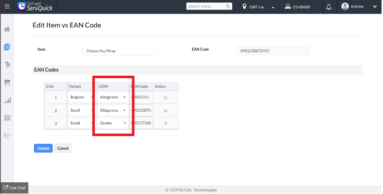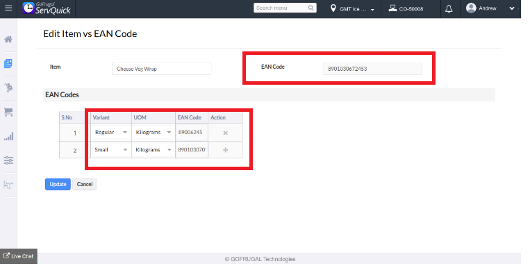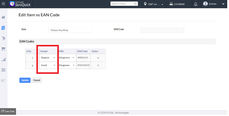 For eg. the ean codes are updated for the item Cheese veg wrap for Regular and Small
