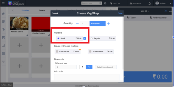 Step 4: The item details window will open with the variant Small selected for the item.