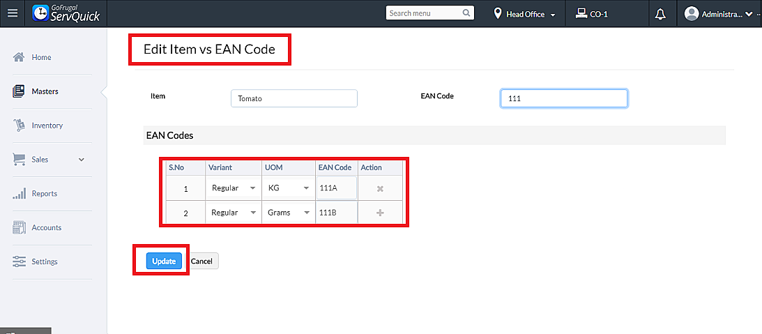 Step 1: Go to Masters->Item v/s Ean code and update the ean codes for the variants with different uoms