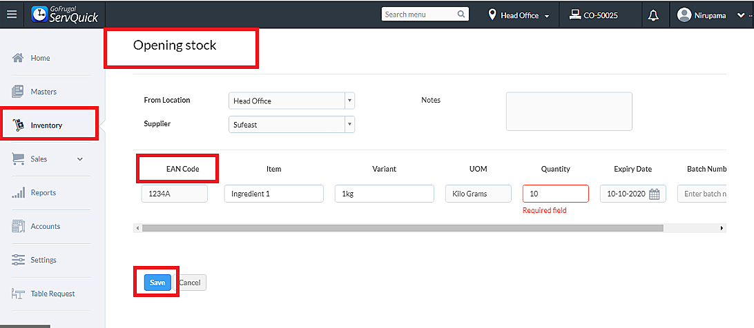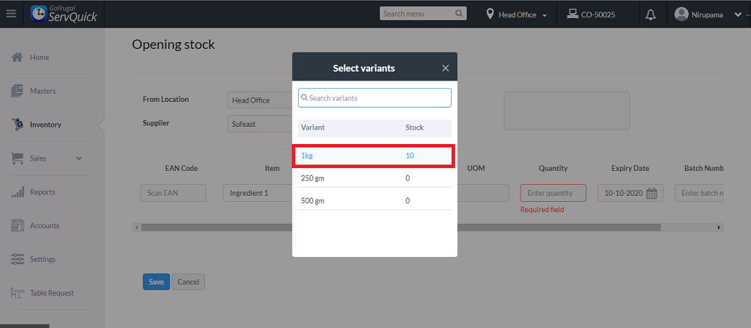 The other fields for item, variant, etc will appear automatically and enter the value in the quantity for the stock and click on Add and Save