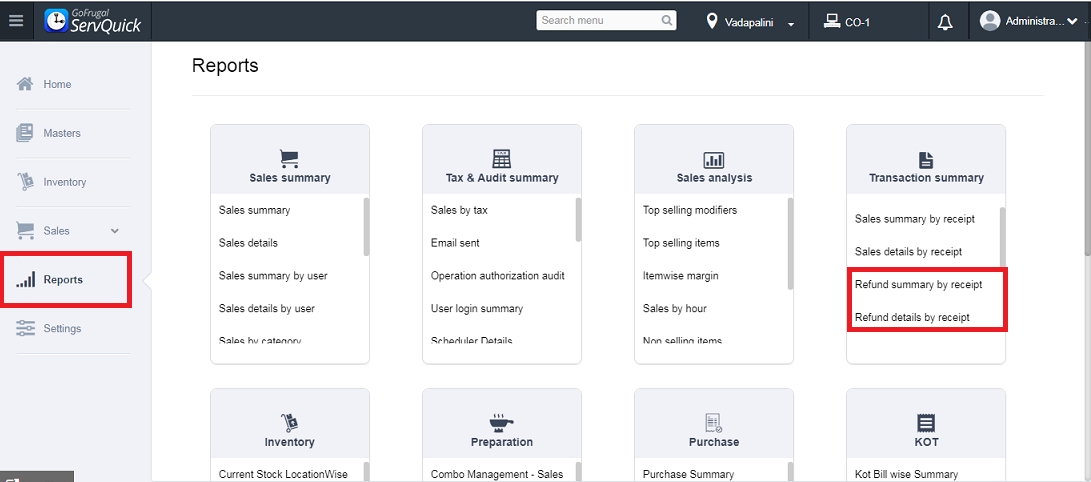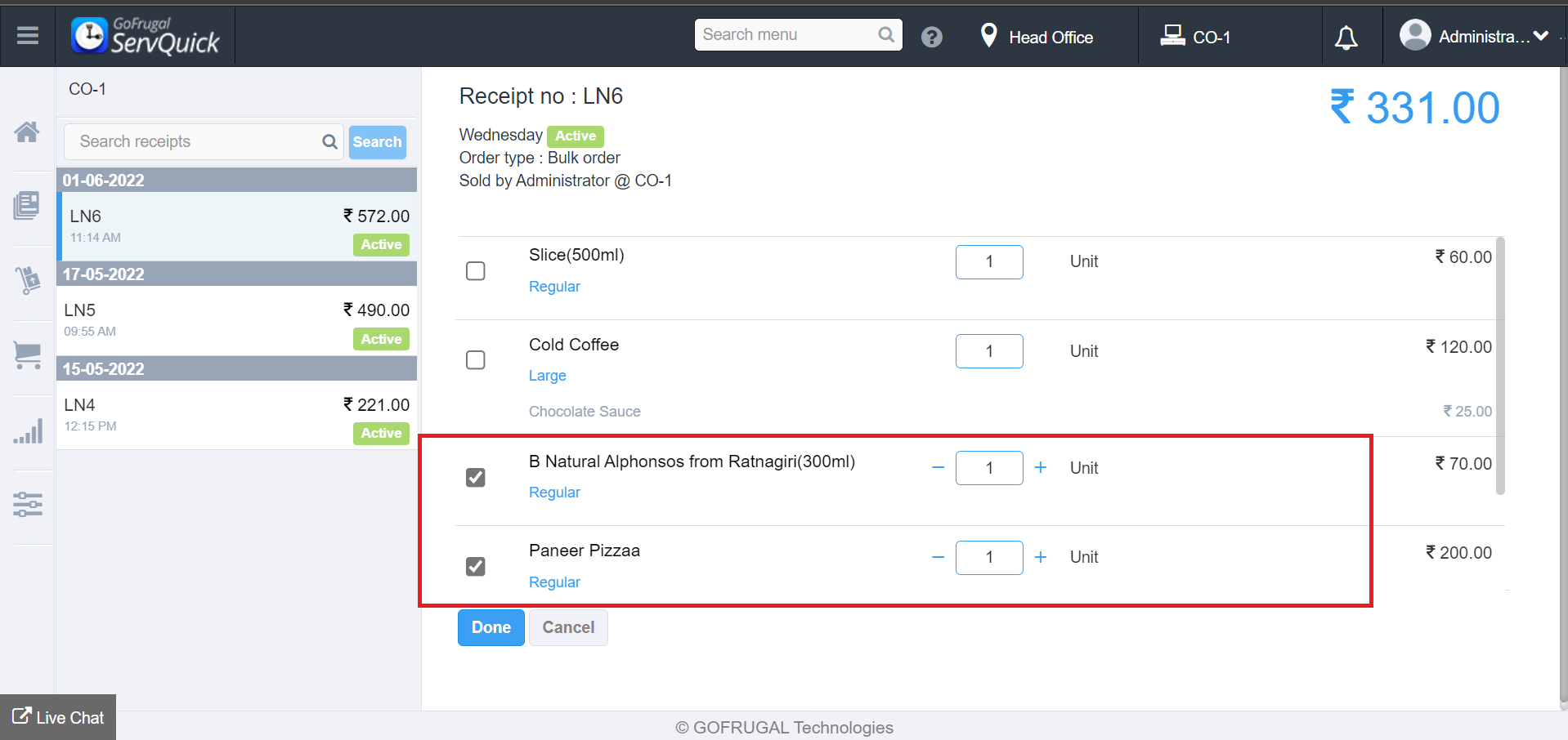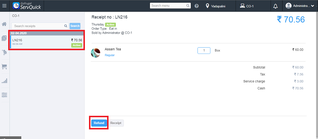 Step 2: Choose the desired receipt for which the refund has to be made and click on Refund. If there are two items in a bill and the refund has to be made for one item, choose the item and click on refund.