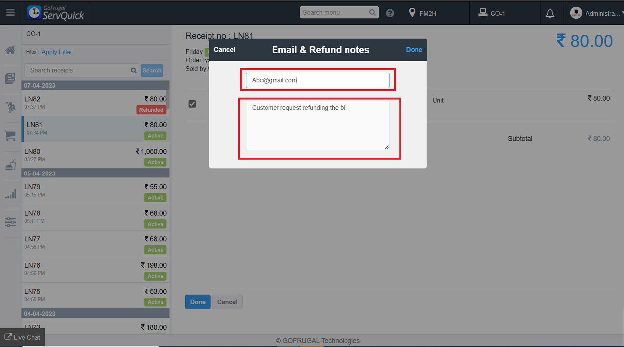 In Receipt Screen , While refunding the invoice pop up of remarks box and Email box will be displayed.