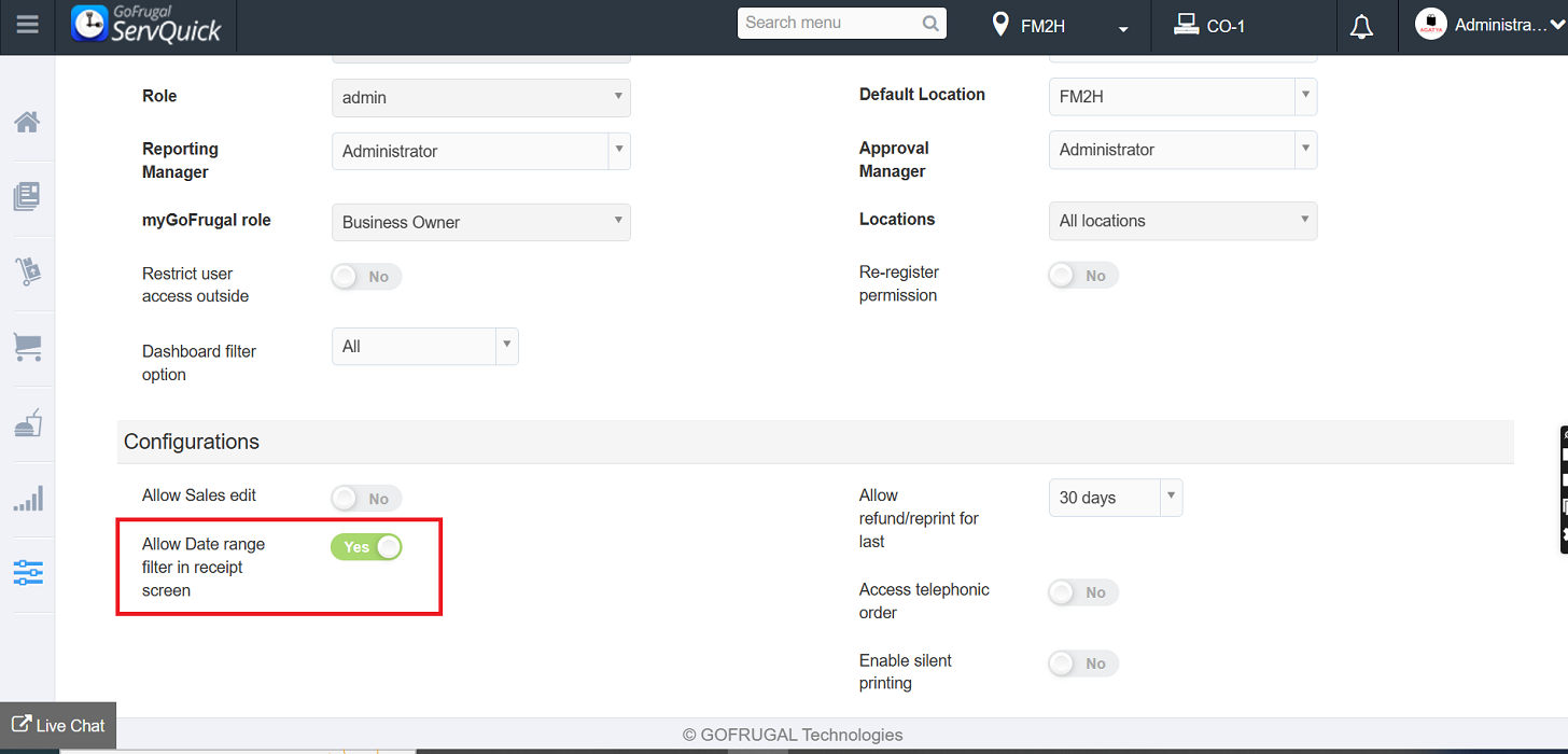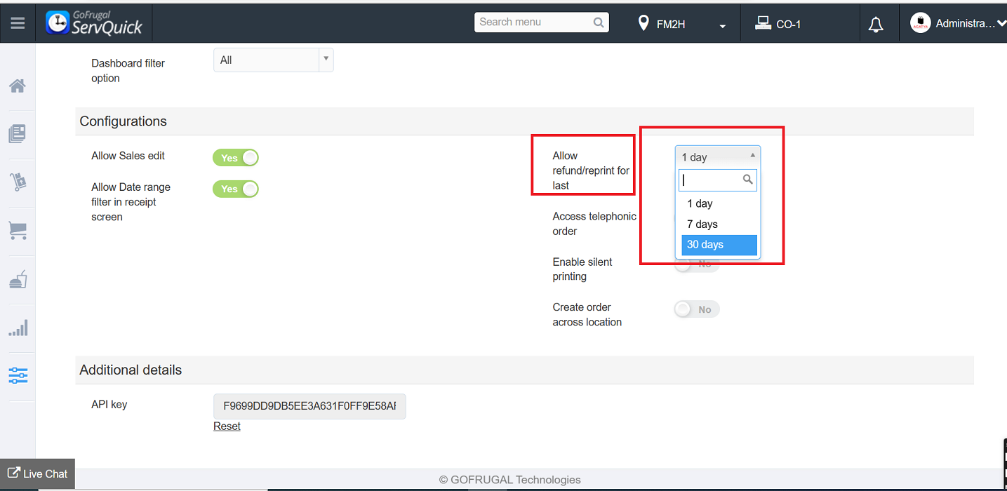 Purpose: The "Allow Refund/Reprint Configuration" will allow us to Refund or Reprint the Invoice as per upto selected days in the configuration. We can choose the number of days from the drop down 1 day or 7 days or 30 days.