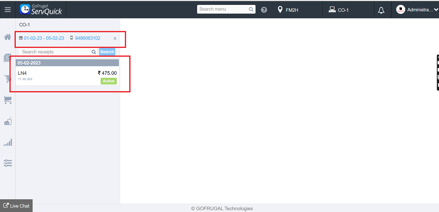 Step 4: Based on the selected date and Customer mobile no , Bills will be filtered.