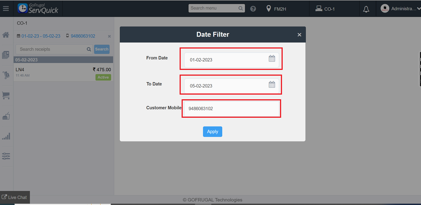 Step 3: Select the "From Date" and To Date" and If you know the "Customer Mobile no" Enter the contact no and Apply