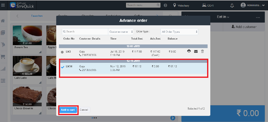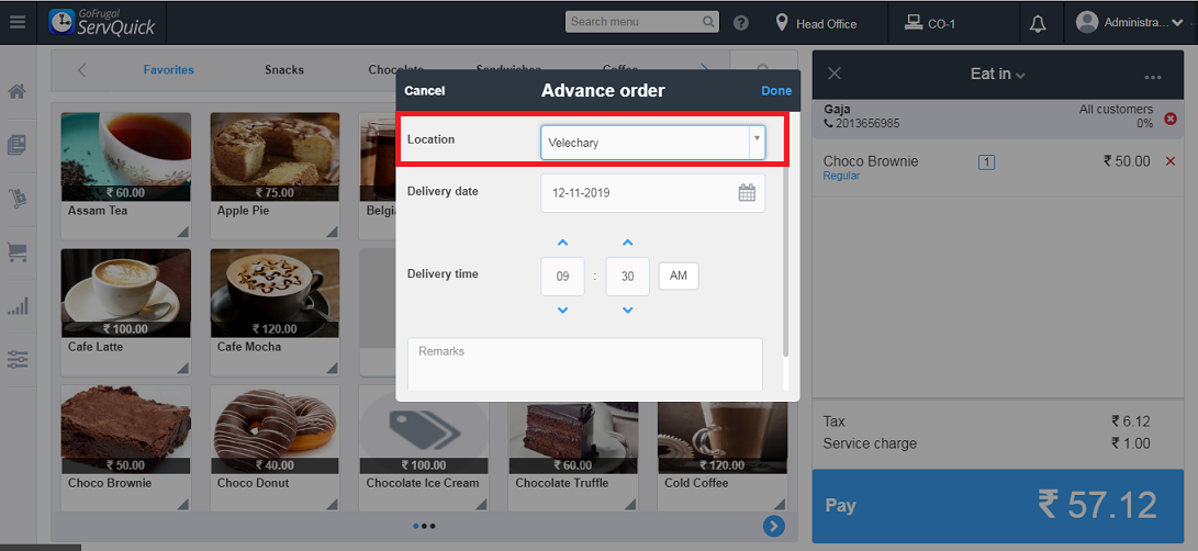 Note: The advance order will be created for the location chosen here. For eg, I have chosen location as Velechary