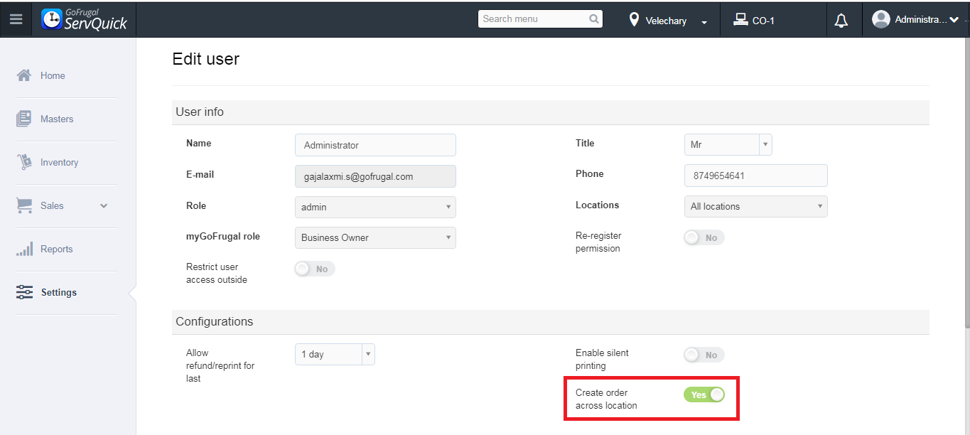 Step 7: Change the location to Velechary to process the order