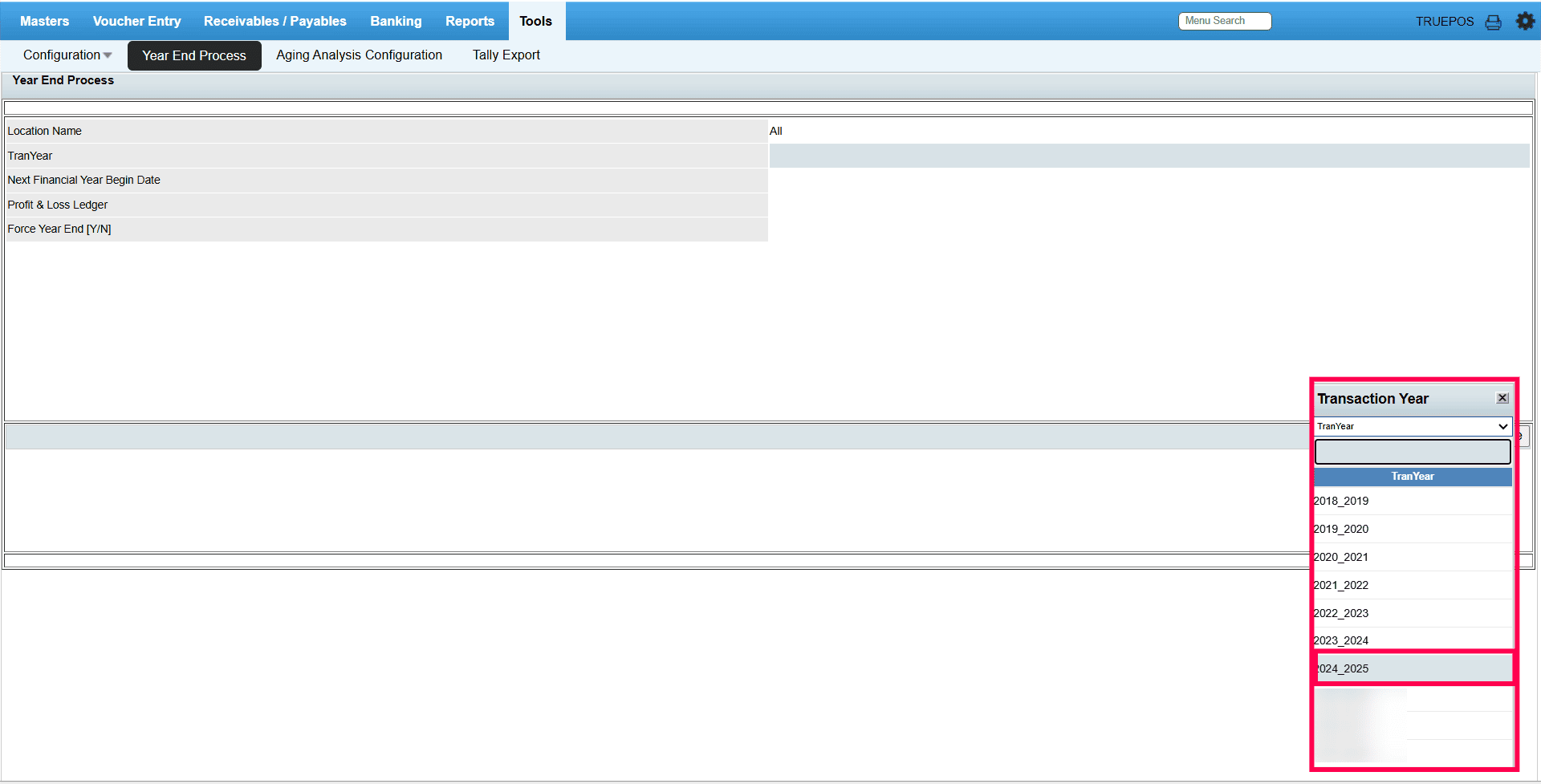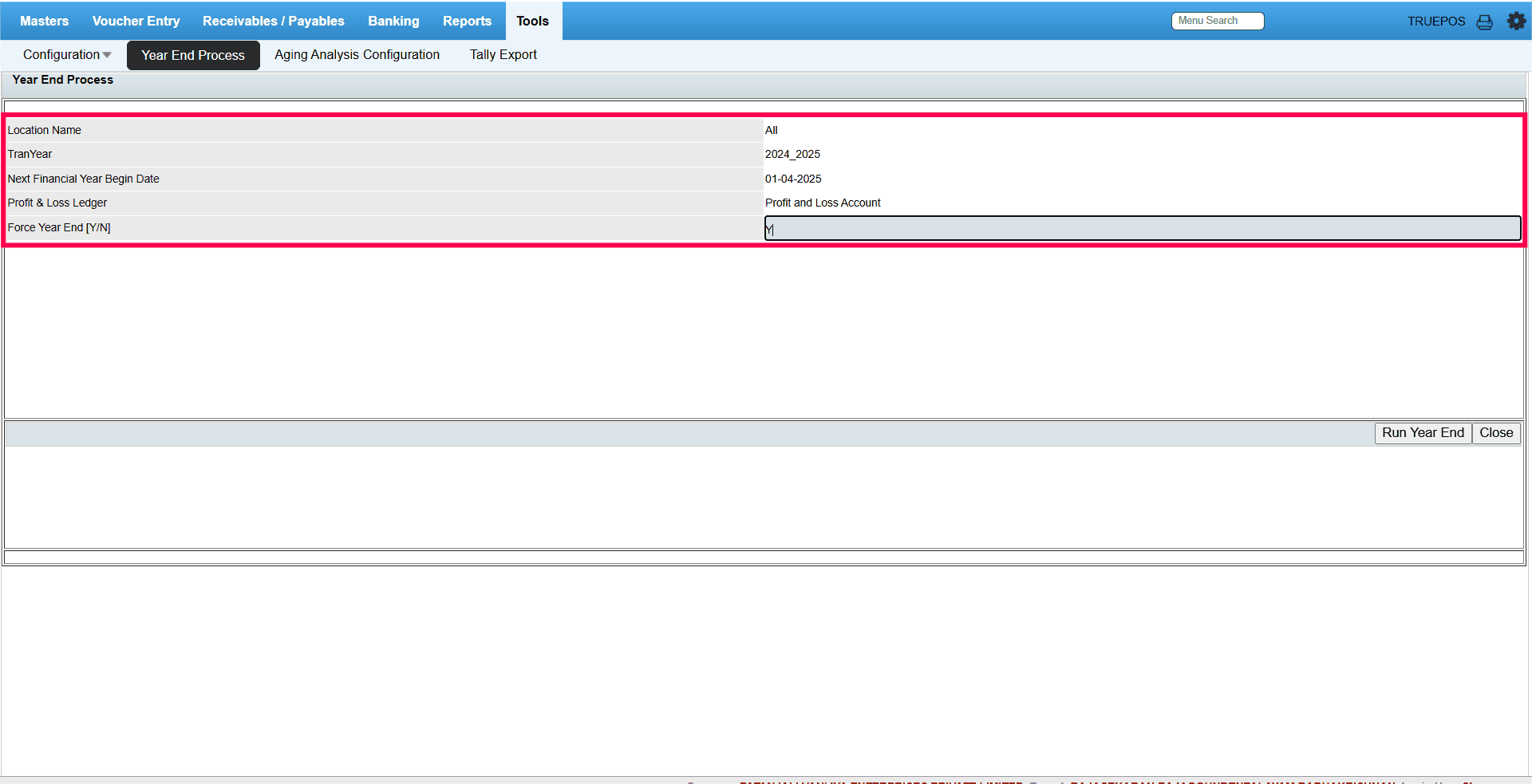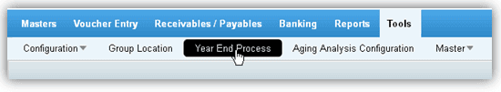 In the Finance and Accounts screen, choose the Tools option and click on Year-End Process