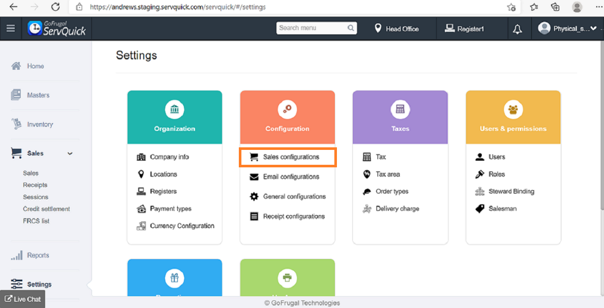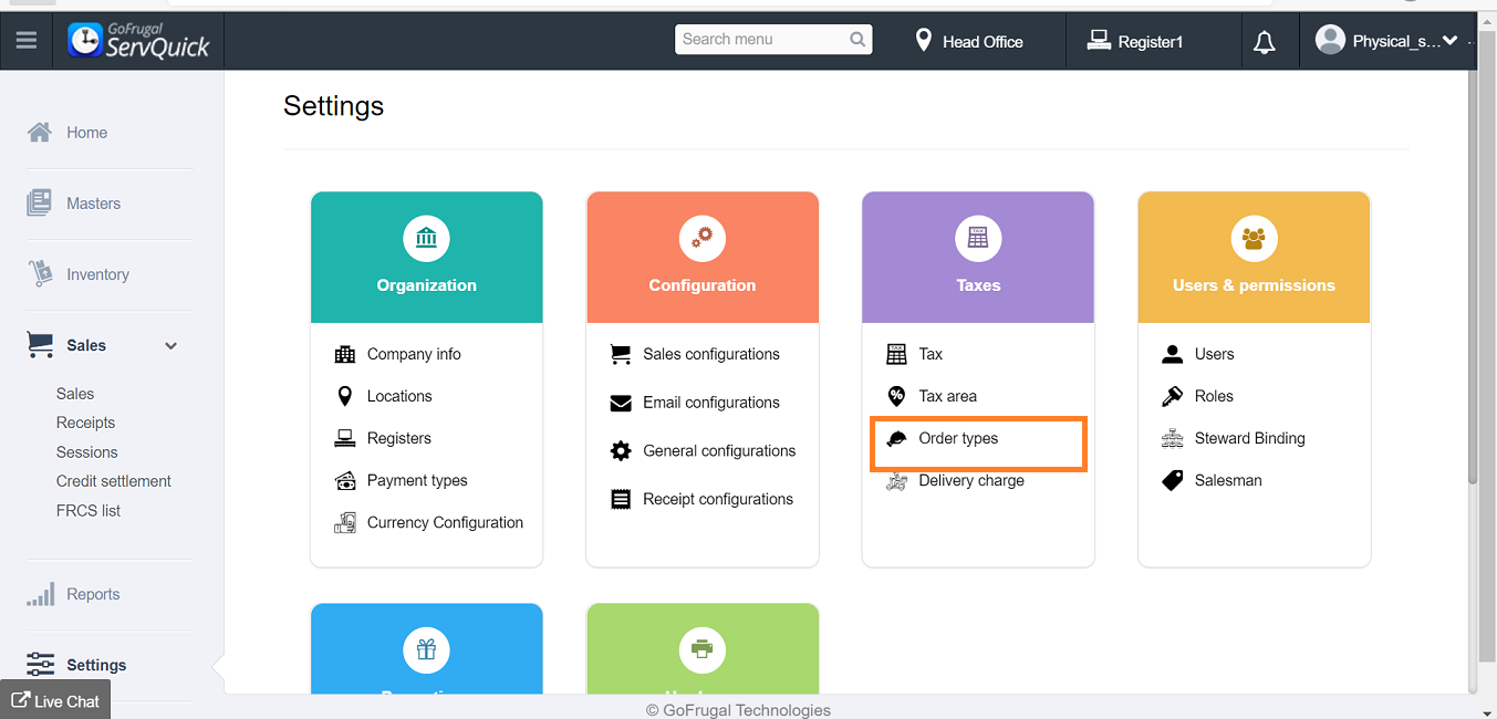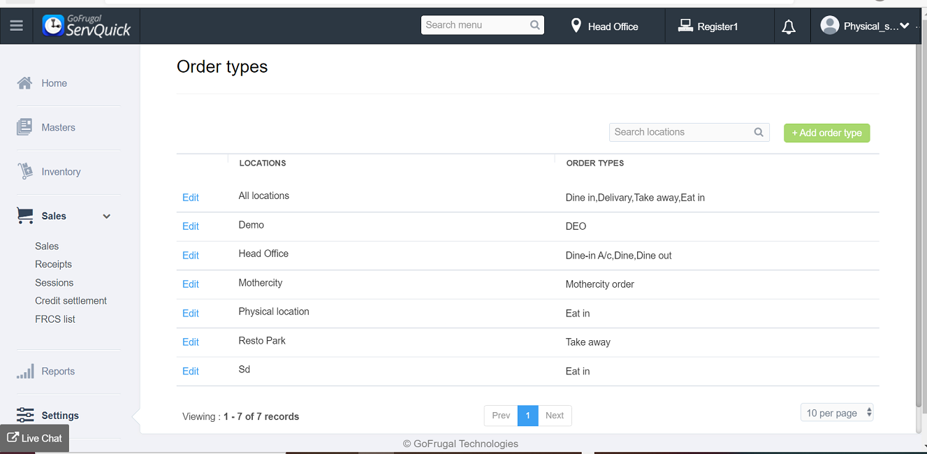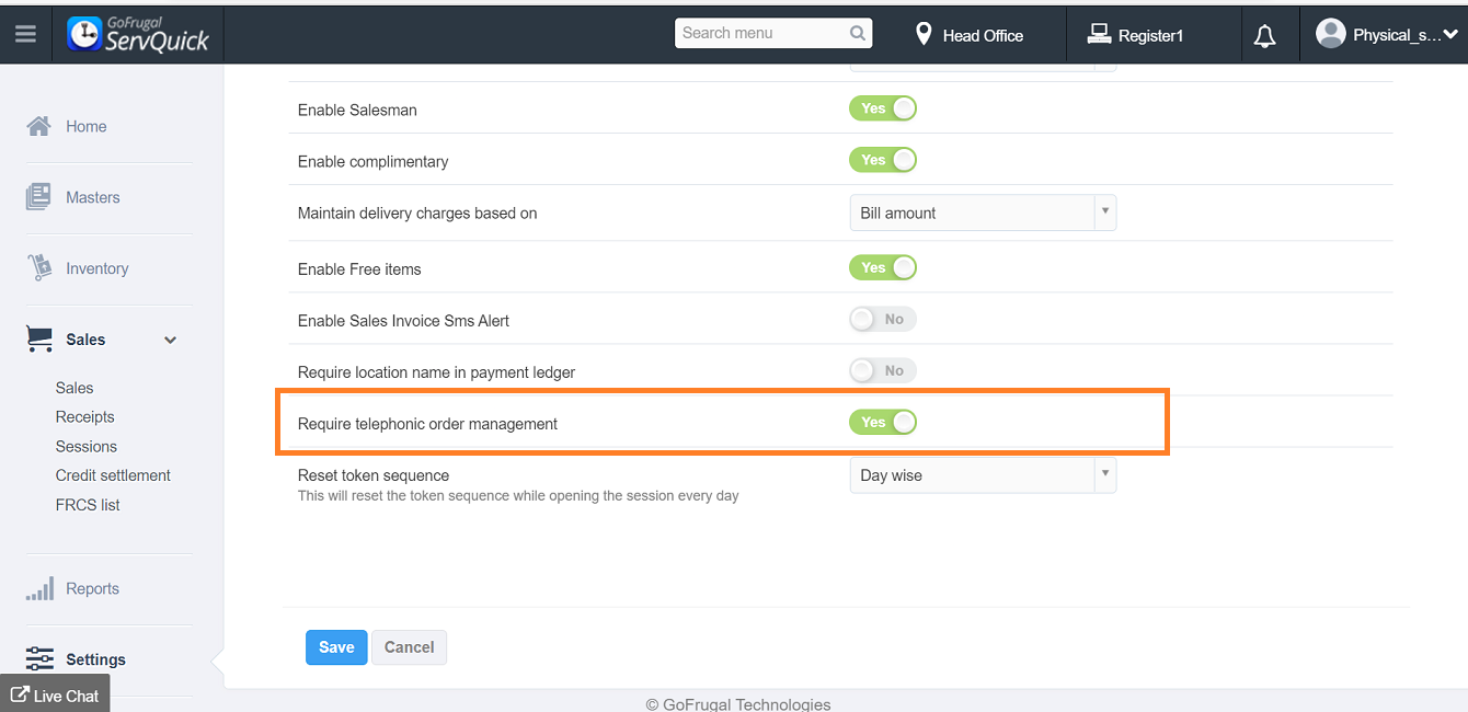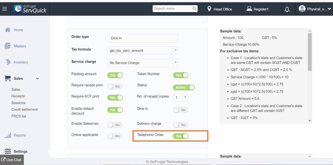 Step 3:Choose the order type Example we will take it as "Dine in" and enable the "Telephonic order" and update.
