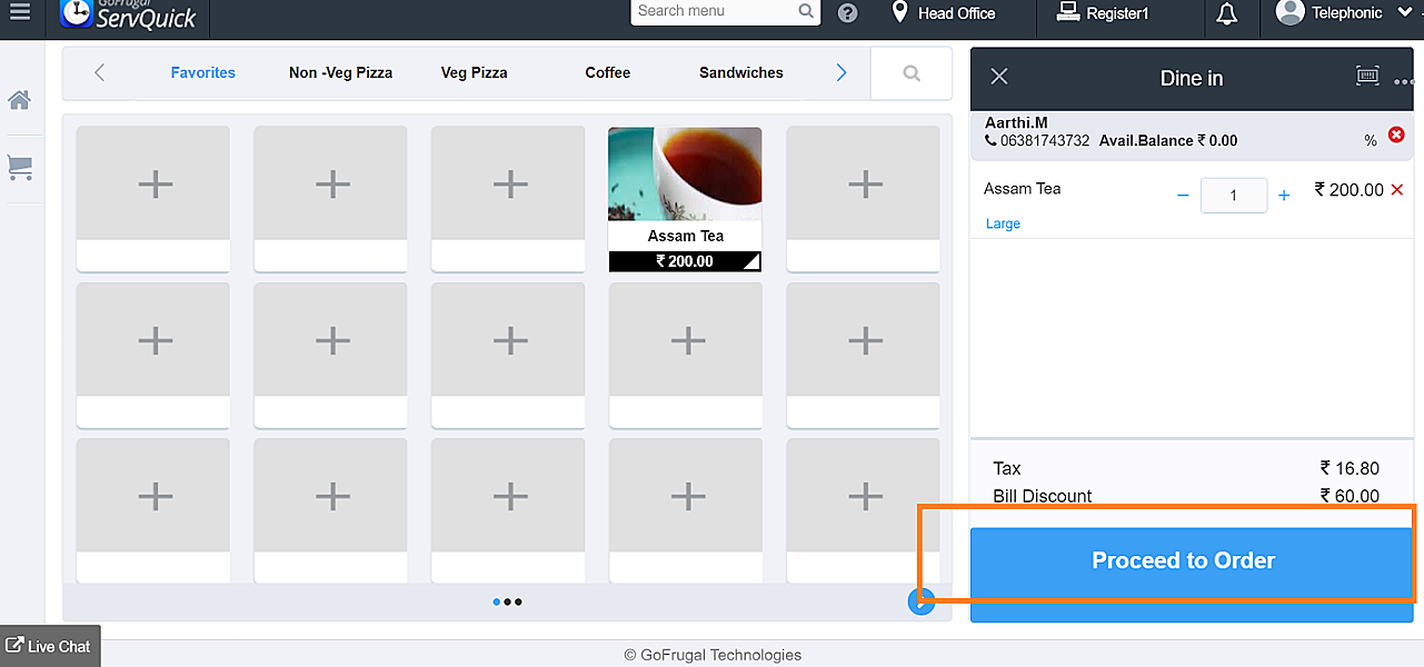 Step 3 : select the item to card which placed by customer through the telephonic call and "proceed to order"