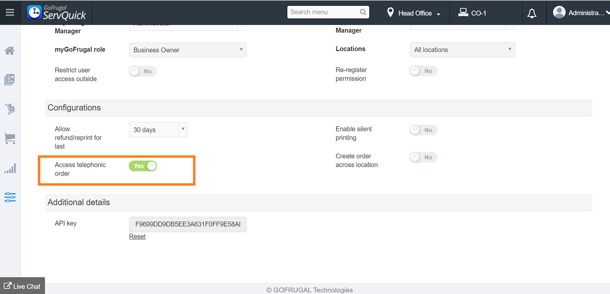 Step :Settings->users and permission->user->select the user from existing or create the user->enable the access telephonic order