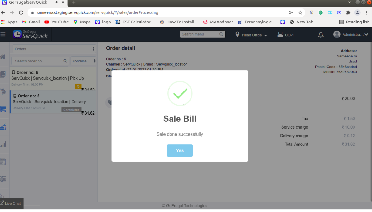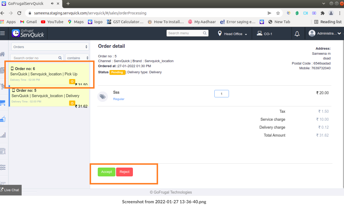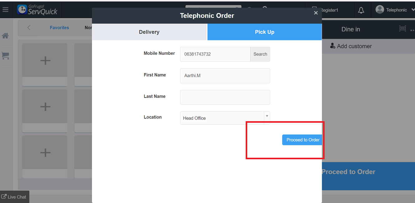 Step 4: After telephonic user given Procced to order , particular location user will get the notification in online order processing screen to "Accept or Reject"