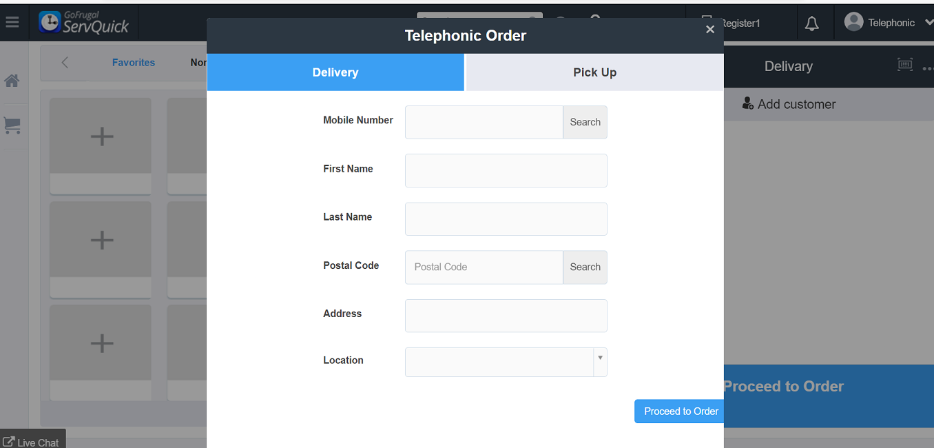 Step 1:Go to sales screen->add customer->Telephonic user will get the pop up of "delivery and pick up details"