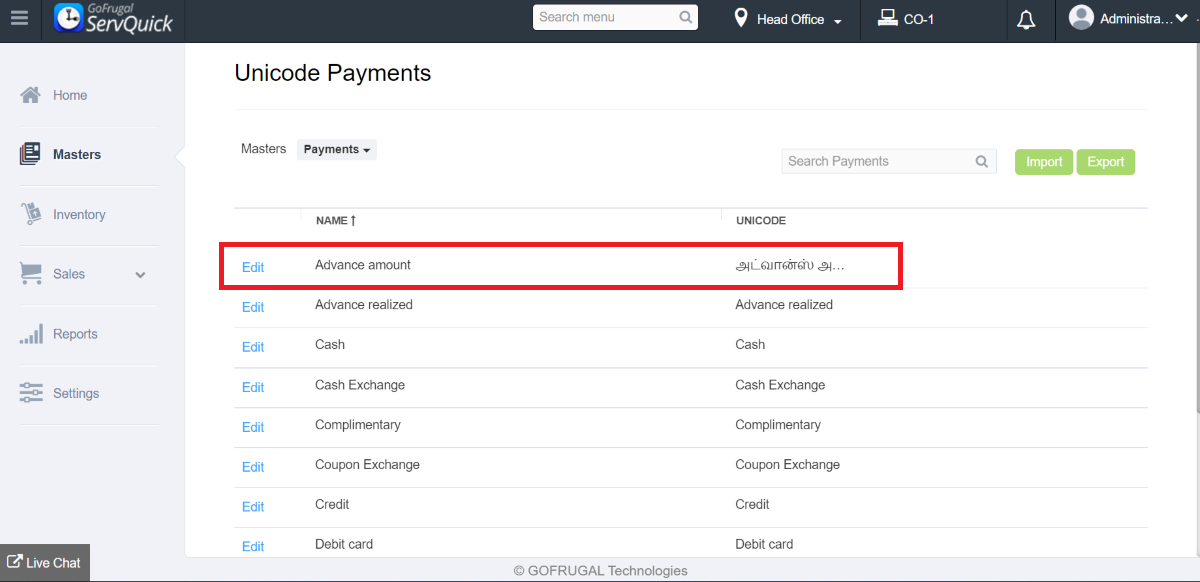 Step 2: Choose the Payment name for which the unicode name has to be given