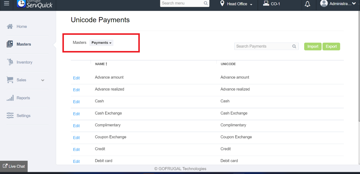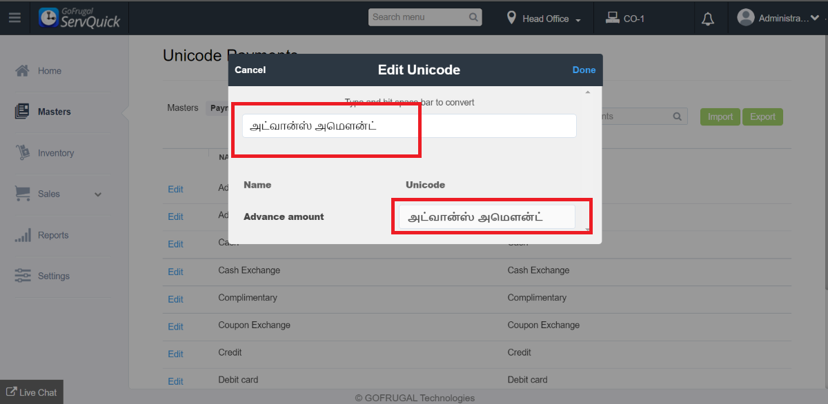 Step 1: Go to Masters->Unicode->Unicode Master->Unicode Payment.