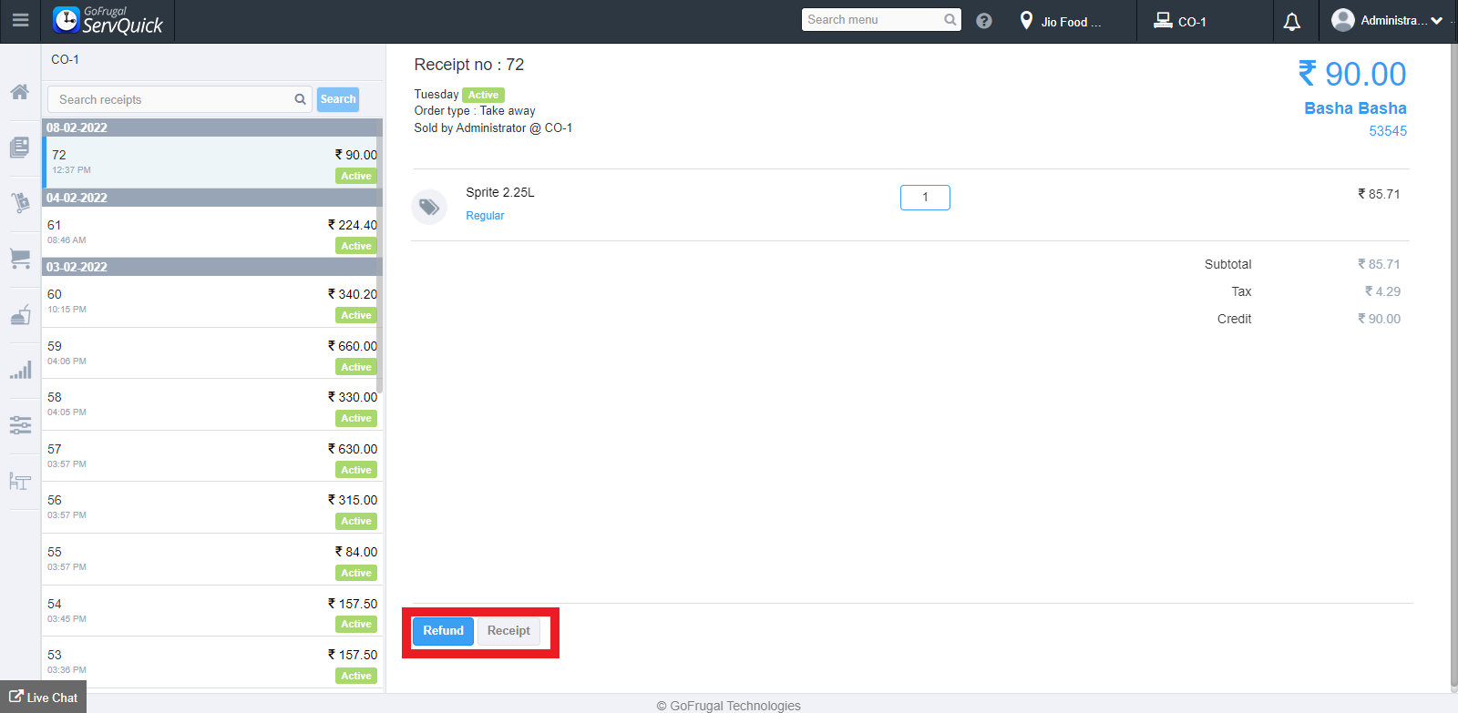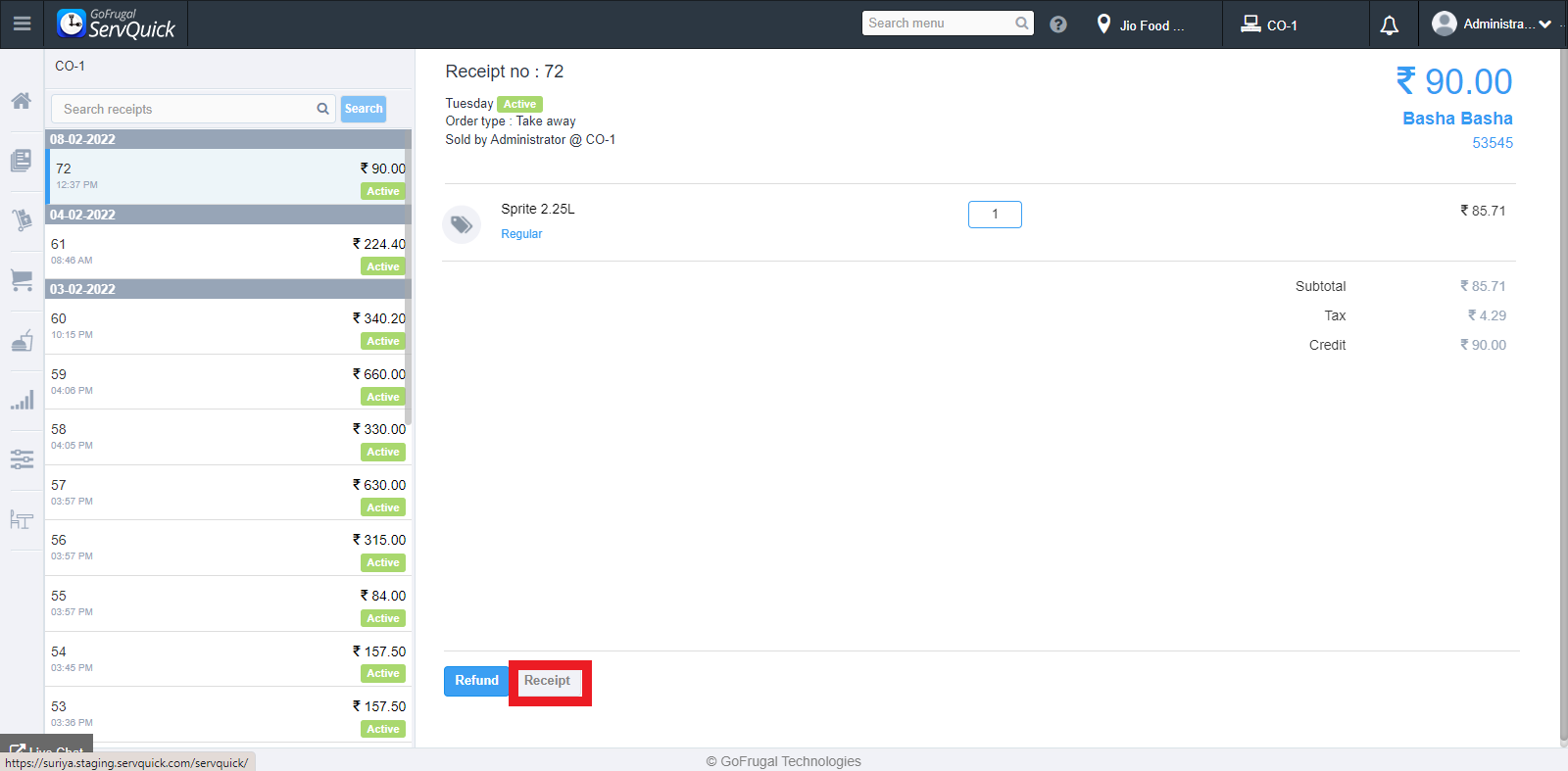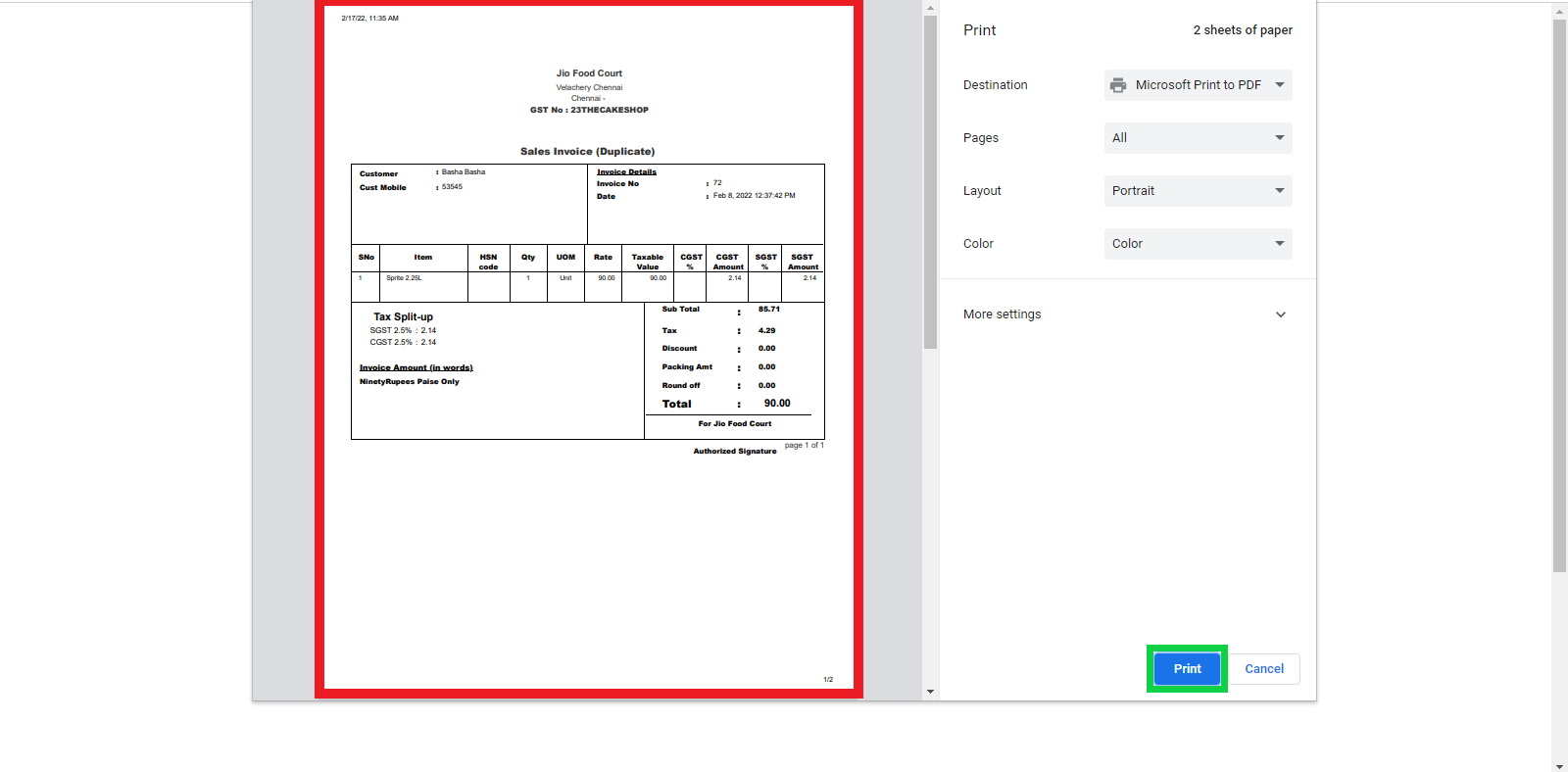 This will generate a printout of the receipt. You can save it on your system or connect directly with the printer to generate a printout.