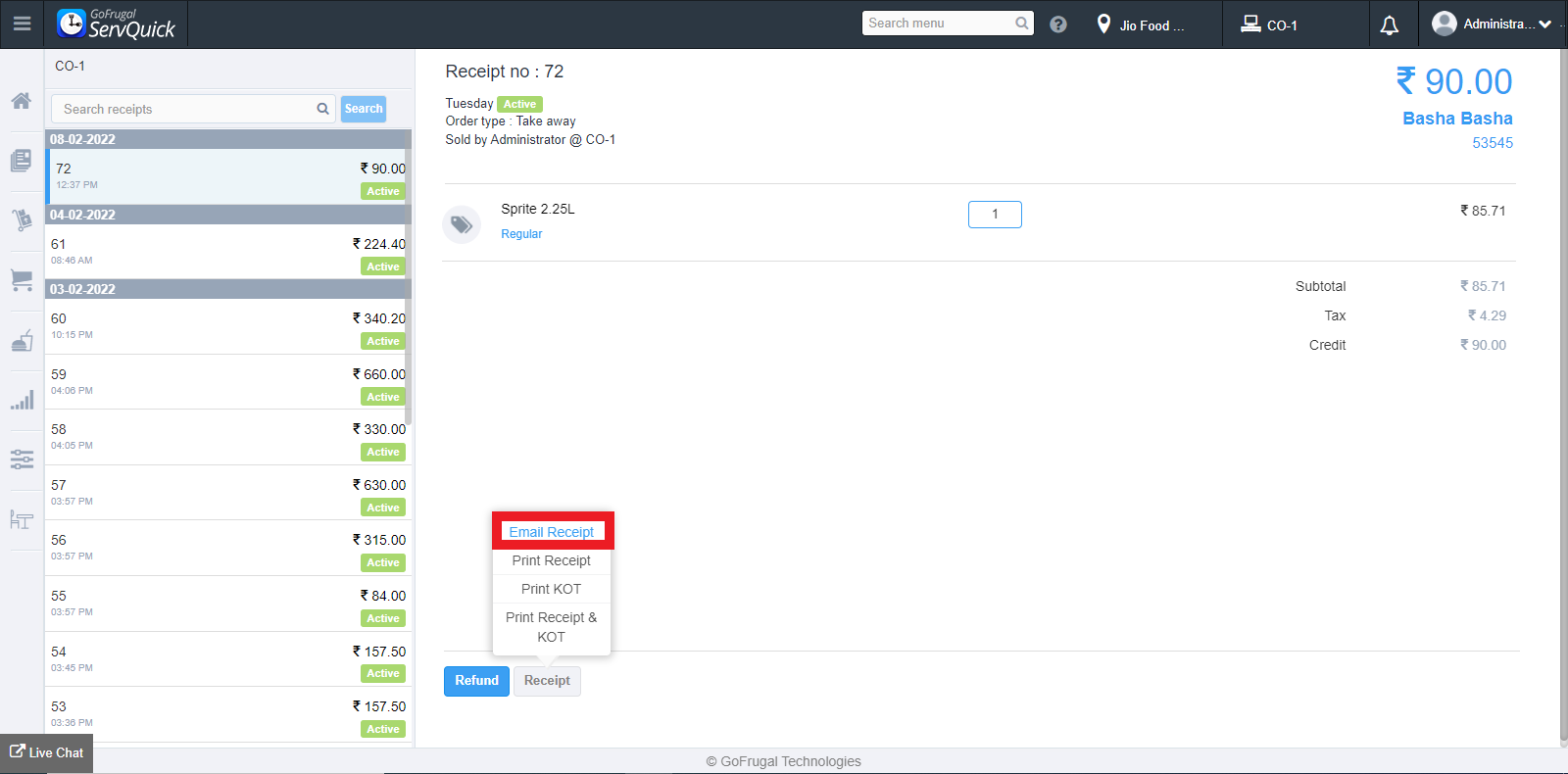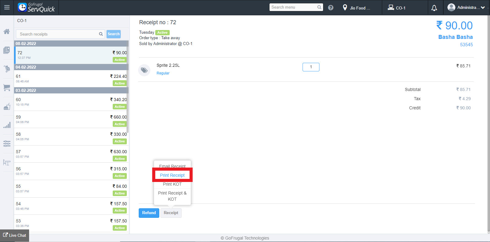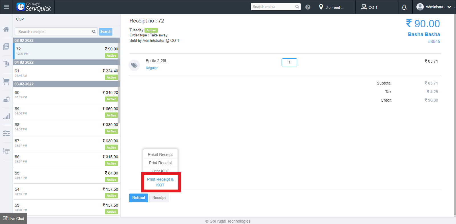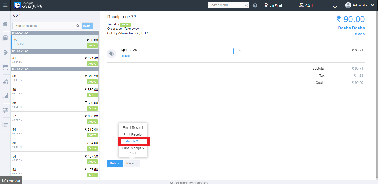 To generate the printout of KOT, click on "Print KOT" on the drop-down.