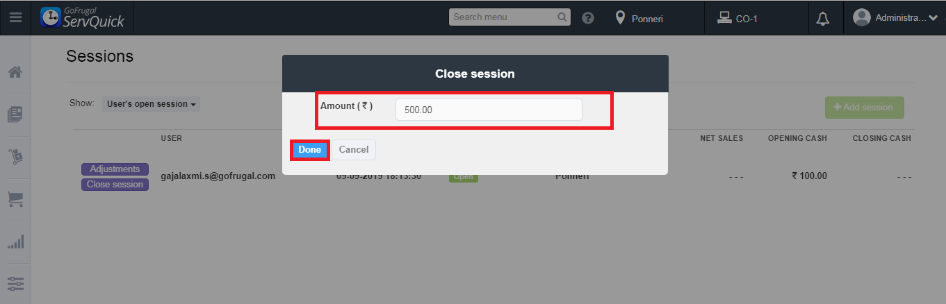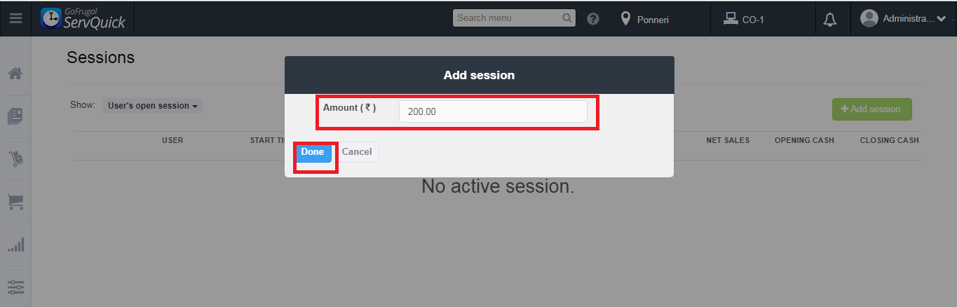 Step 4: Enter the Amount (opening balance) for that particular session and click on Done. Opening amount is the amount present in the cash drawer while starting a session